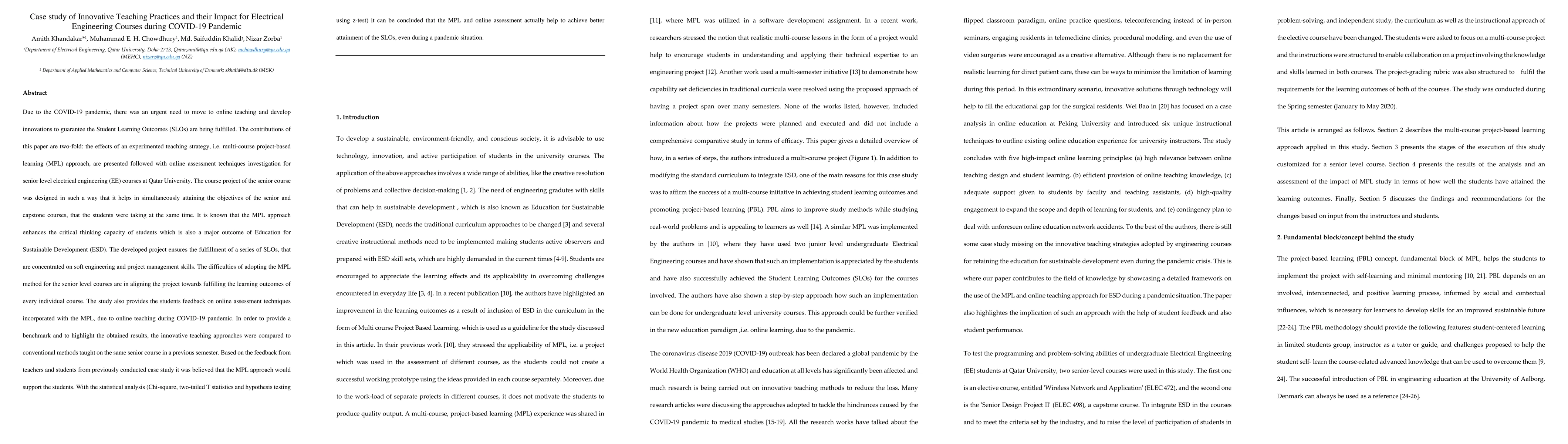 Due to the COVID-19 pandemic, there was an urgent need to move to online teaching and develop innovations to guarantee the Student Learning Outcomes (SLOs) are being fulfilled. The contributions of this paper are two-fold: the effects of an experimented teaching strategy, i.e. multi-course project-based learning (MPL) approach, are presented followed with online assessment techniques investigation for senior level electrical engineering (EE) courses at Qatar University. The course project of the senior course was designed in such a way that it helps in simultaneously attaining the objectives of the senior and capstone courses, that the students were taking at the same time. It is known that the MPL approach enhances the critical thinking capacity of students which is also a major outcome of Education for Sustainable Development (ESD). The developed project ensures the fulfillment of a series of SLOs, that are concentrated on soft engineering and project management skills. The difficulties of adopting the MPL method for the senior level courses are in aligning the project towards fulfilling the learning outcomes of every individual course. The study also provides the students feedback on online assessment techniques incorporated with the MPL, due to online teaching during COVID-19 pandemic. In order to provide a benchmark and to highlight the obtained results, the innovative teaching approaches were compared to conventional methods taught on the same senior course in a previous semester. Based on the feedback from teachers and students from previously conducted case study it was believed that the MPL approach would support the students. With the statistical analysis (Chi-square, two-tailed T statistics and hypothesis testing using z-test) it can be concluded that the MPL and online assessment actually help to achieve better attainment of the SLOs, even during a pandemic situation.