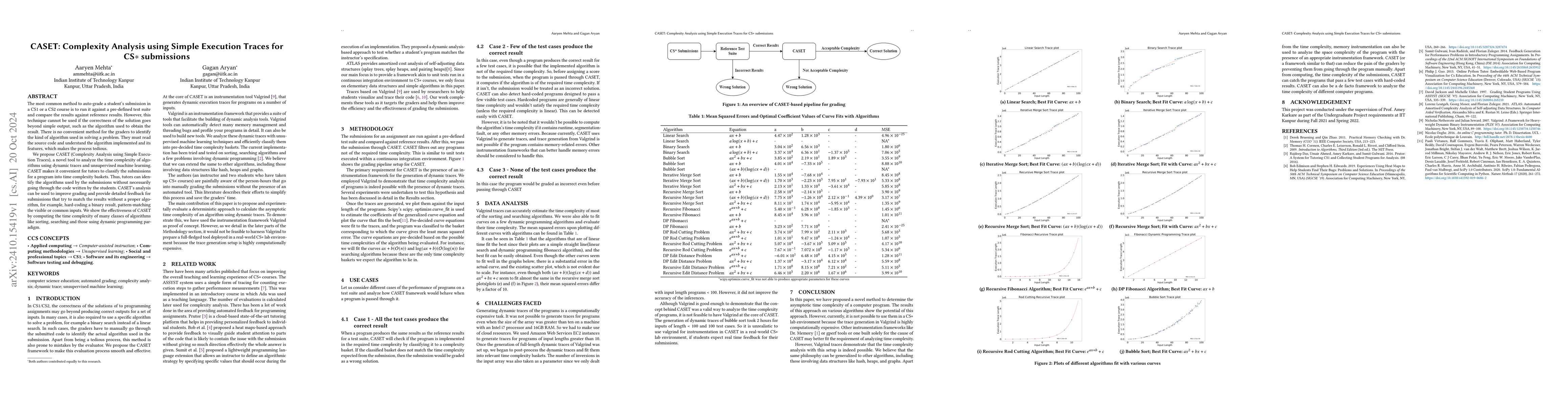 The paper proposes CASET, a tool for analyzing time complexity in student submissions using execution traces and unsupervised machine learning, aiming to simplify the grading process by identifying algorithms without requiring code inspection. CASET demonstrates effectiveness in classifying various algorithms such as sorting and searching.