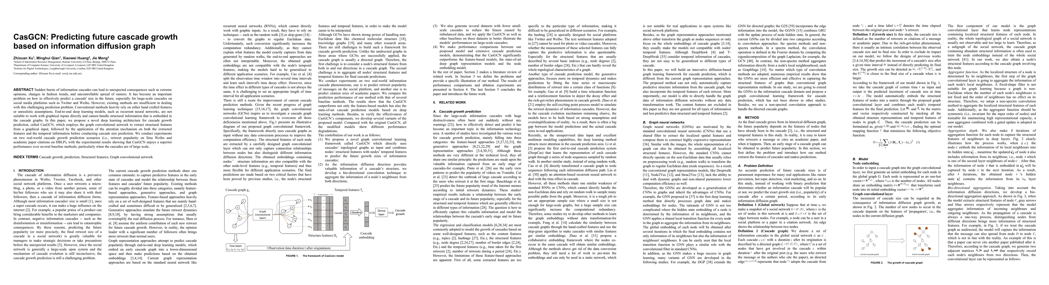 The paper introduces CasGCN, a novel deep learning architecture that uses graph convolutional networks to extract structural features from information diffusion graphs, combined with an attention mechanism for temporal information, to predict future cascade growth on social media platforms. Experiments on retweet popularity and academic paper citations demonstrate that CasGCN outperforms existing methods, especially for large-scale cascades.