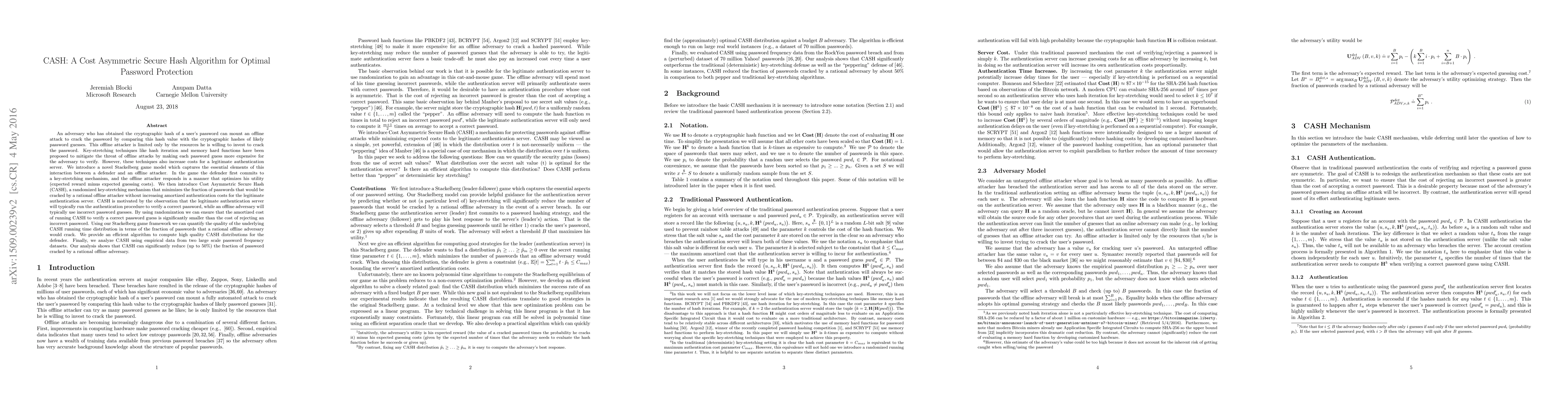 The paper introduces CASH, a Cost Asymmetric Secure Hash mechanism designed to mitigate offline attacks on password hashes by making incorrect guesses costly for attackers while minimizing authentication costs for legitimate users. Through a Stackelberg game model, CASH optimizes the balance between security and efficiency.