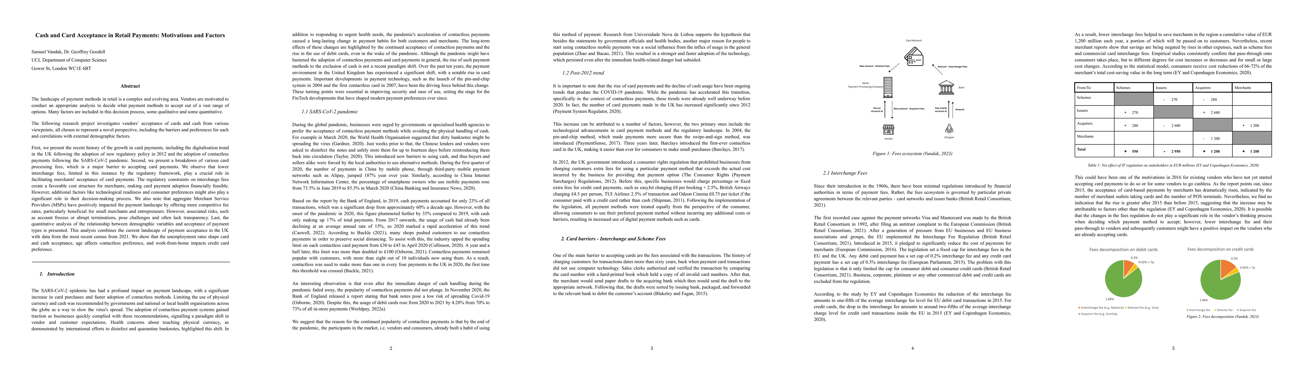 This research explores the motivations and factors influencing retailers' acceptance of cash and card payments, highlighting the role of lower interchange fees and regulatory frameworks. It also examines how technological readiness, consumer preferences, and demographic factors like unemployment rates and age influence the adoption of card and cash payments in the UK.
