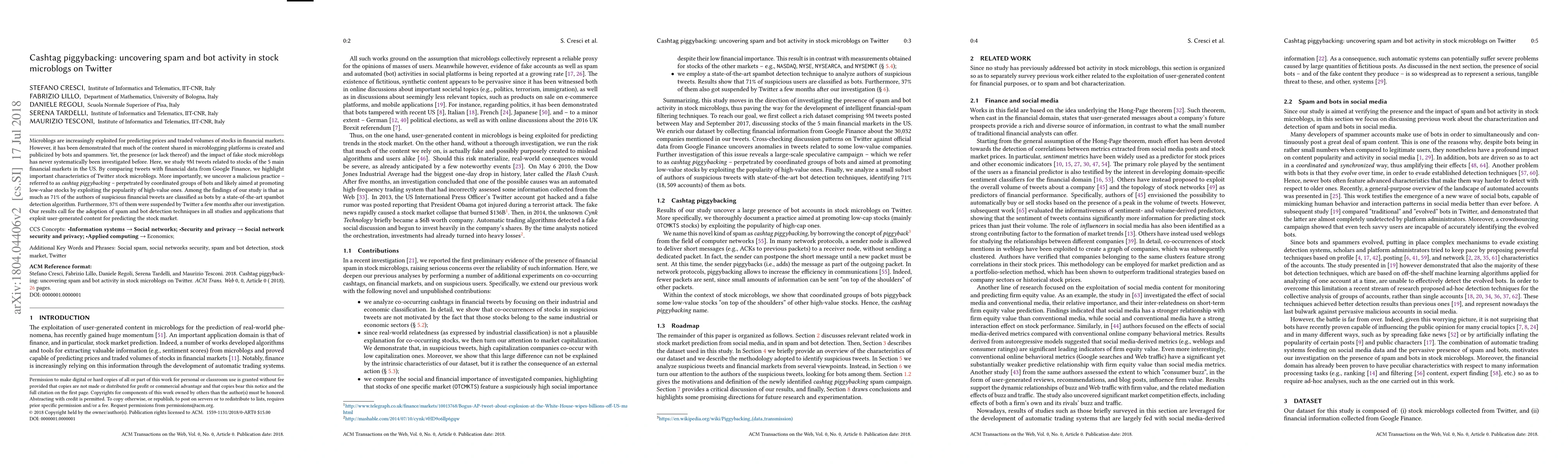 Microblogs are increasingly exploited for predicting prices and traded volumes of stocks in financial markets. However, it has been demonstrated that much of the content shared in microblogging platforms is created and publicized by bots and spammers. Yet, the presence (or lack thereof) and the impact of fake stock microblogs has never systematically been investigated before. Here, we study 9M tweets related to stocks of the 5 main financial markets in the US. By comparing tweets with financial data from Google Finance, we highlight important characteristics of Twitter stock microblogs. More importantly, we uncover a malicious practice - referred to as cashtag piggybacking - perpetrated by coordinated groups of bots and likely aimed at promoting low-value stocks by exploiting the popularity of high-value ones. Among the findings of our study is that as much as 71% of the authors of suspicious financial tweets are classified as bots by a state-of-the-art spambot detection algorithm. Furthermore, 37% of them were suspended by Twitter a few months after our investigation. Our results call for the adoption of spam and bot detection techniques in all studies and applications that exploit user-generated content for predicting the stock market.