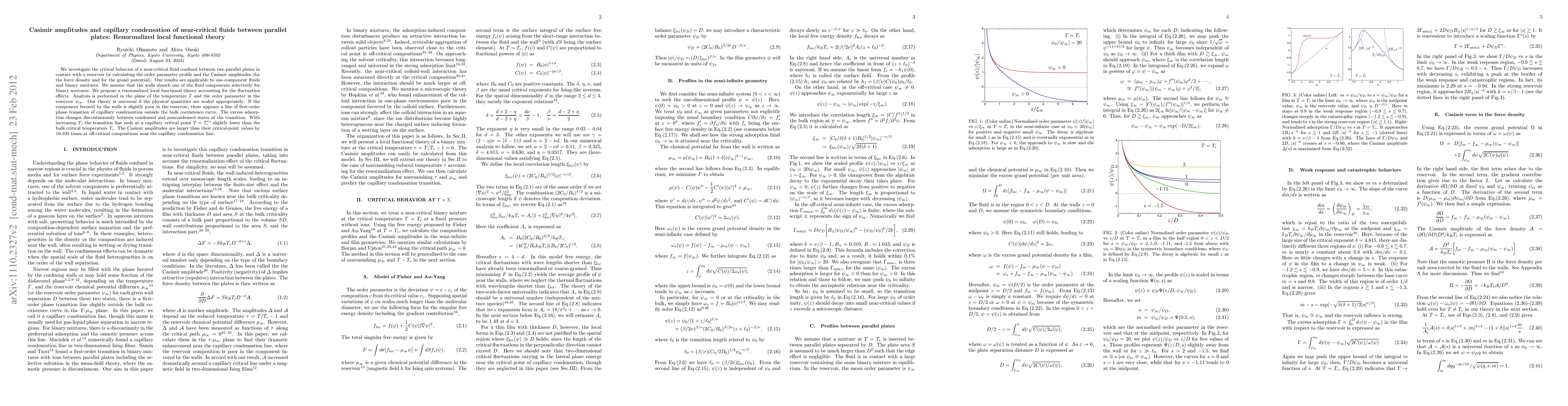 This paper investigates the critical behavior of near-critical fluids confined between parallel plates, calculating the Casimir amplitudes and order parameter profiles. It proposes a renormalized local functional theory to account for fluctuation effects, revealing a line of first-order capillary condensation phase transition outside the bulk coexistence curve.