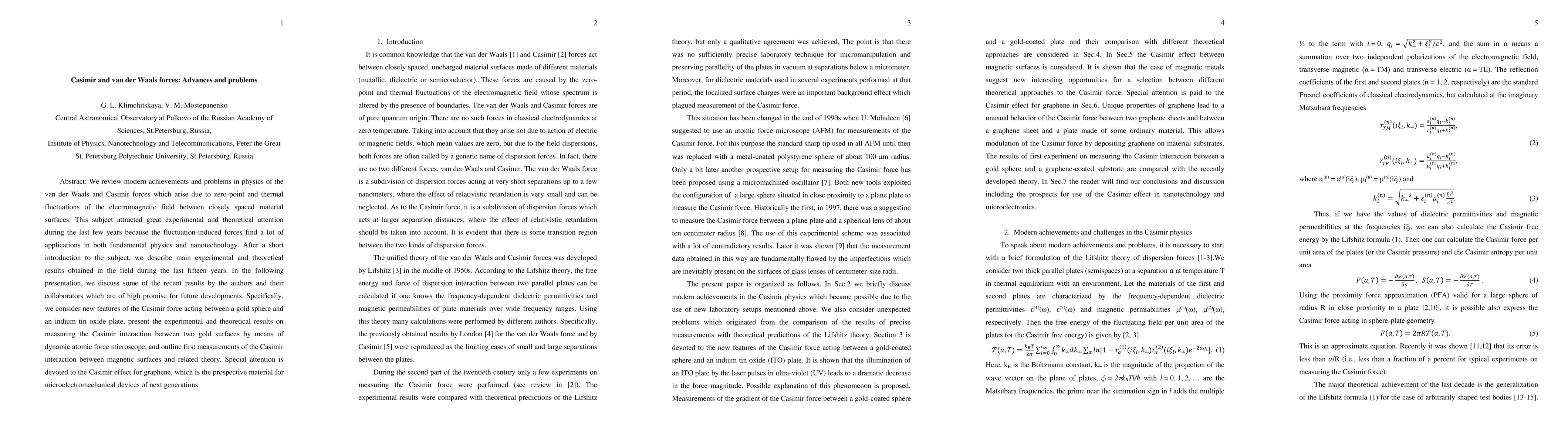 This paper reviews recent advancements and challenges in the study of Casimir and van der Waals forces, focusing on their applications in nanotechnology and fundamental physics. It highlights new experimental and theoretical results, including the Casimir force between a gold sphere and an indium tin oxide plate, and the interaction between magnetic surfaces, with special emphasis on the potential of graphene in future microelectromechanical devices.