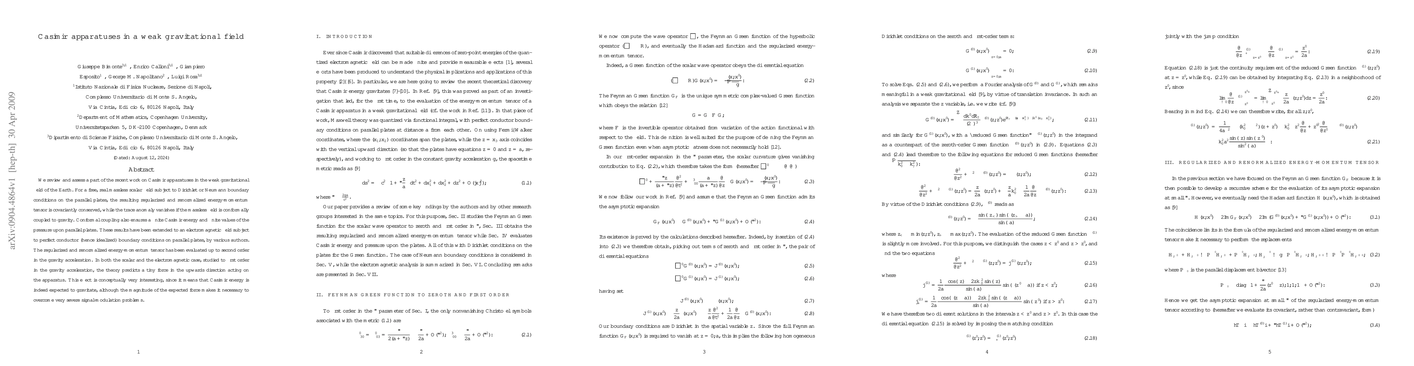 We review and assess a part of the recent work on Casimir apparatuses in the weak gravitational field of the Earth. For a free, real massless scalar field subject to Dirichlet or Neumann boundary conditions on the parallel plates, the resulting regularized and renormalized energy-momentum tensor is covariantly conserved, while the trace anomaly vanishes if the massless field is conformally coupled to gravity. Conformal coupling also ensures a finite Casimir energy and finite values of the pressure upon parallel plates. These results have been extended to an electromagnetic field subject to perfect conductor (hence idealized) boundary conditions on parallel plates, by various authors. The regularized and renormalized energy-momentum tensor has been evaluated up to second order in the gravity acceleration. In both the scalar and the electromagnetic case, studied to first order in the gravity acceleration, the theory predicts a tiny force in the upwards direction acting on the apparatus. This effect is conceptually very interesting, since it means that Casimir energy is indeed expected to gravitate, although the magnitude of the expected force makes it necessary to overcome very severe signal-modulation problems.