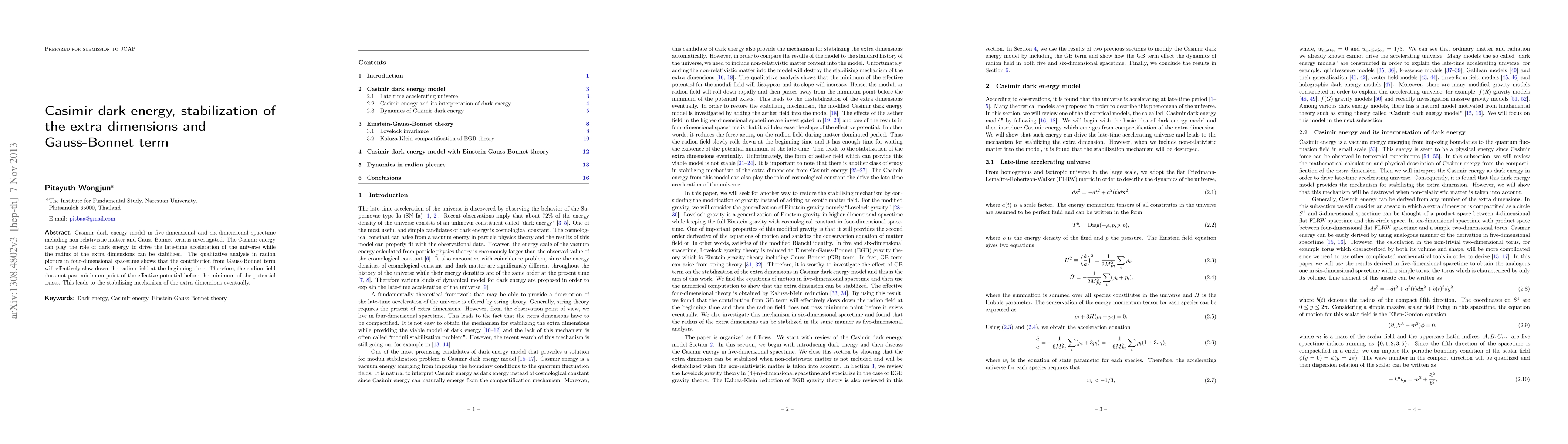 Casimir dark energy model in five-dimensional and six-dimensional spacetime including non-relativistic matter and Gauss-Bonnet term is investigated. The Casimir energy can play the role of dark energy to drive the late-time acceleration of the universe while the radius of the extra dimensions can be stabilized. The qualitative analysis in radion picture in four-dimensional spacetime shows that the contribution from Gauss-Bonnet term will effectively slow down the radion field at the beginning time. Therefore, the radion field does not pass minimum point of the effective potential before the minimum of the potential exists. This leads to the stabilizing mechanism of the extra dimensions eventually.