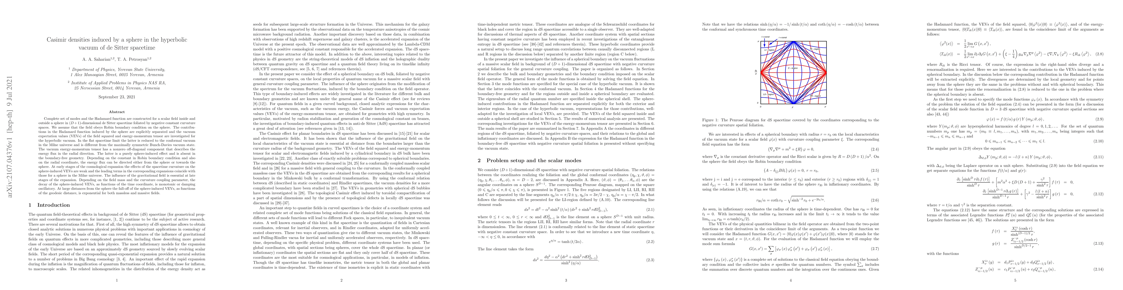 Complete set of modes and the Hadamard function are constructed for a scalar field inside and outside a sphere in (D+1)-dimensional de Sitter spacetime foliated by negative constant curvature spaces. We assume that the field obeys Robin boundary condition on the sphere. The contributions in the Hadamard function induced by the sphere are explicitly separated and the vacuum expectation values (VEVs) of the field squared and energy-momentum tensor are investigated for the hyperbolic vacuum. In the flat spacetime limit the latter is reduced to the conformal vacuum in the Milne universe and is different from the maximally symmetric Bunch-Davies vacuum state. The vacuum energy-momentum tensor has a nonzero off-diagonal component that describes the energy flux in the radial direction. The latter is a purely sphere-induced effect and is absent in the boundary-free geometry. Depending on the constant in Robin boundary condition and also on the radial coordinate, the energy flux can be directed either from the sphere or towards the sphere. At early stages of the cosmological expansion the effects of the spacetime curvature on the sphere-induced VEVs are weak and the leading terms in the corresponding expansions coincide with those for a sphere in the Milne universe. The influence of the gravitational field is essential at late stages of the expansion. Depending on the field mass and the curvature coupling parameter, the decay of the sphere-induced VEVs, as functions of the time coordinate, is monotonic or damping oscillatory. At large distances from the sphere the fall-off of the sphere-induced VEVs, as functions of the geodesic distance, is exponential for both massless and massive fields.