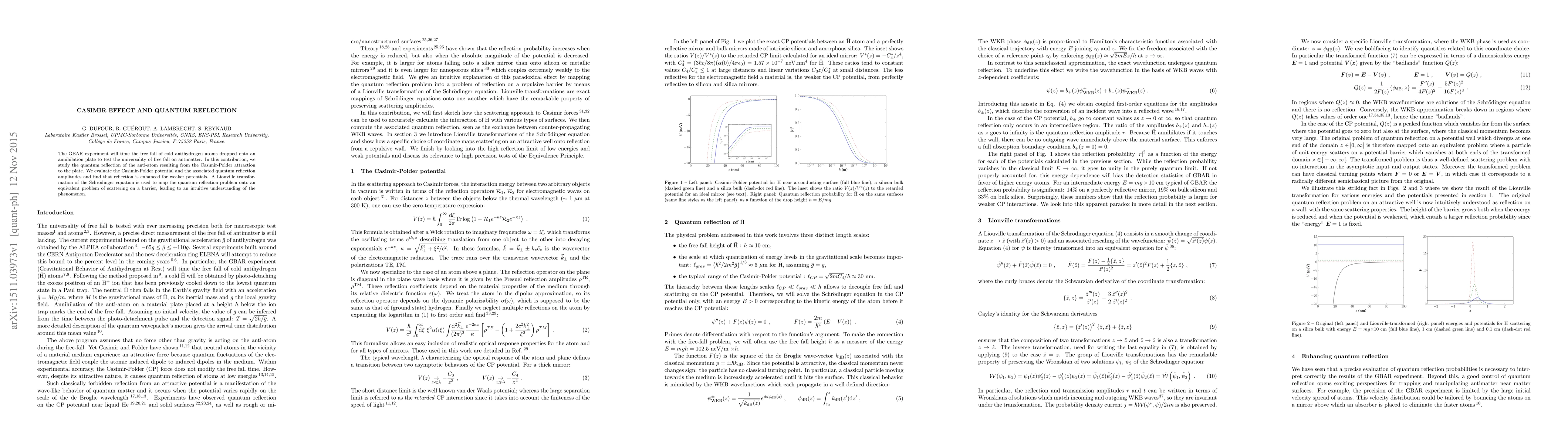 The GBAR experiment will time the free fall of cold antihydrogen atoms dropped onto an annihilation plate to test the universality of free fall on antimatter. In this contribution, we study the quantum reflection of the anti-atom resulting from the Casimir-Polder attraction to the plate. We evaluate the Casimir-Polder potential and the associated quantum reflection amplitudes and find that reflection is enhanced for weaker potentials. A Liouville transformation of the Schr\"odinger equation is used to map the quantum reflection problem onto an equivalent problem of scattering on a barrier, leading to an intuitive understanding of the phenomenon.