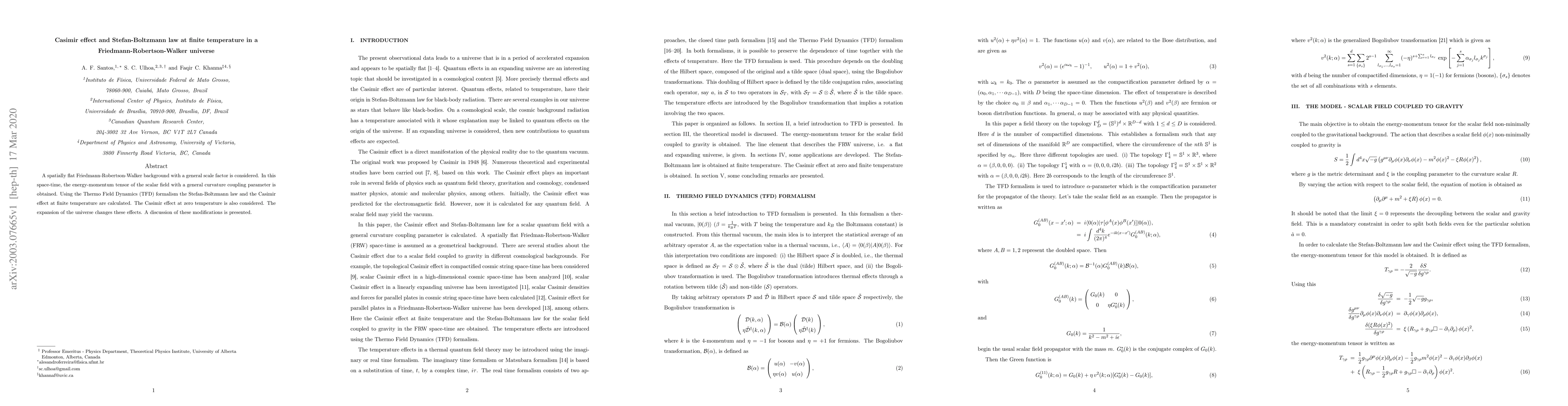 A spatially flat Friedmann-Robertson-Walker background with a general scale factor is considered. In this space-time, the energy-momentum tensor of the scalar field with a general curvature coupling parameter is obtained. Using the Thermo Field Dynamics (TFD) formalism the Stefan-Boltzmann law and the Casimir effect at finite temperature are calculated. The Casimir effect at zero temperature is also considered. The expansion of the universe changes these effects. A discussion of these modifications is presented.
