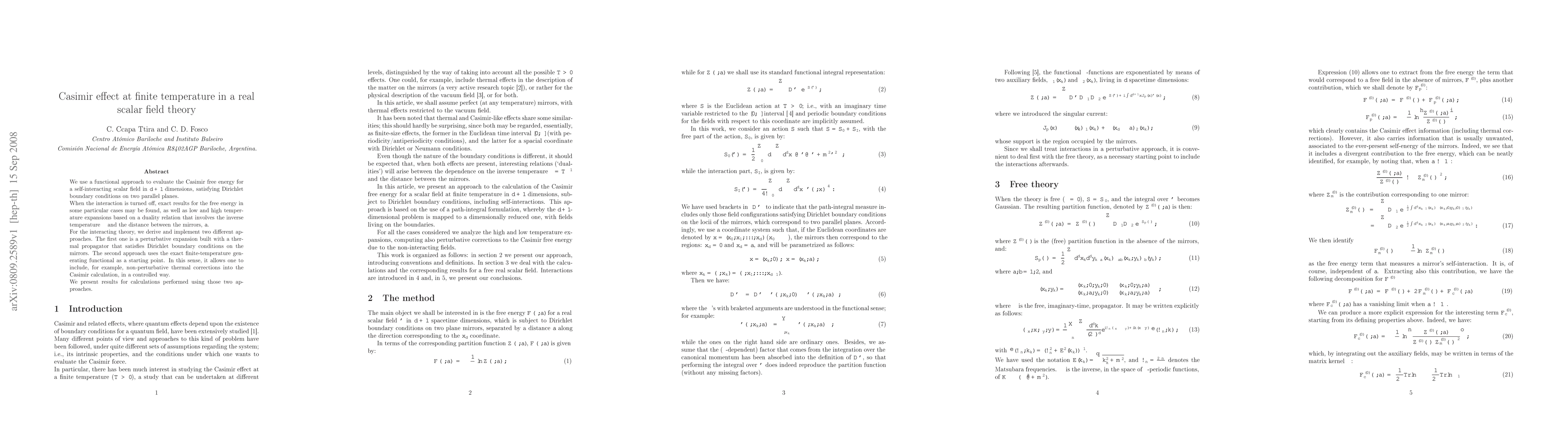 We use a functional approach to evaluate the Casimir free energy for a self-interacting scalar field in $d+1$ dimensions, satisfying Dirichlet boundary conditions on two parallel planes. When the interaction is turned off, exact results for the free energy in some particular cases may be found, as well as low and high temperature expansions based on a duality relation that involves the inverse temperature $\beta$ and the distance between the mirrors, $a$. For the interacting theory, we derive and implement two different approaches. The first one is a perturbative expansion built with a thermal propagator that satisfies Dirichlet boundary conditions on the mirrors. The second approach uses the exact finite-temperature generating functional as a starting point. In this sense, it allows one to include, for example, non-perturbative thermal corrections into the Casimir calculation, in a controlled way. We present results for calculations performed using those two approaches.