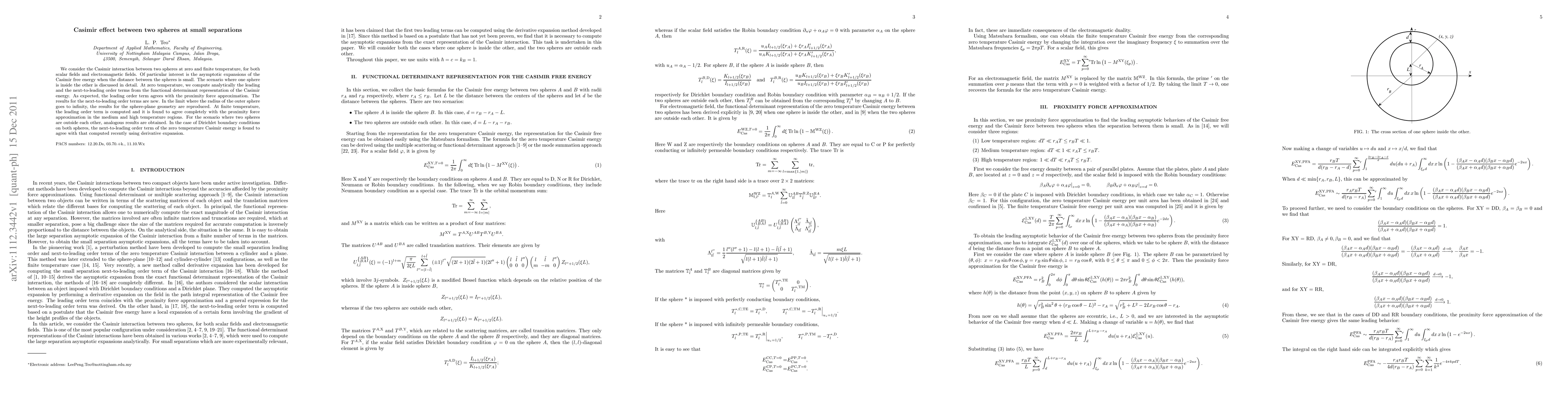 This paper investigates the Casimir effect between two spheres at small separations, focusing on both scalar and electromagnetic fields. It provides new analytical results for the next-to-leading order terms in the Casimir free energy, confirming the proximity force approximation for the leading order term and reproducing sphere-plane geometry limits.