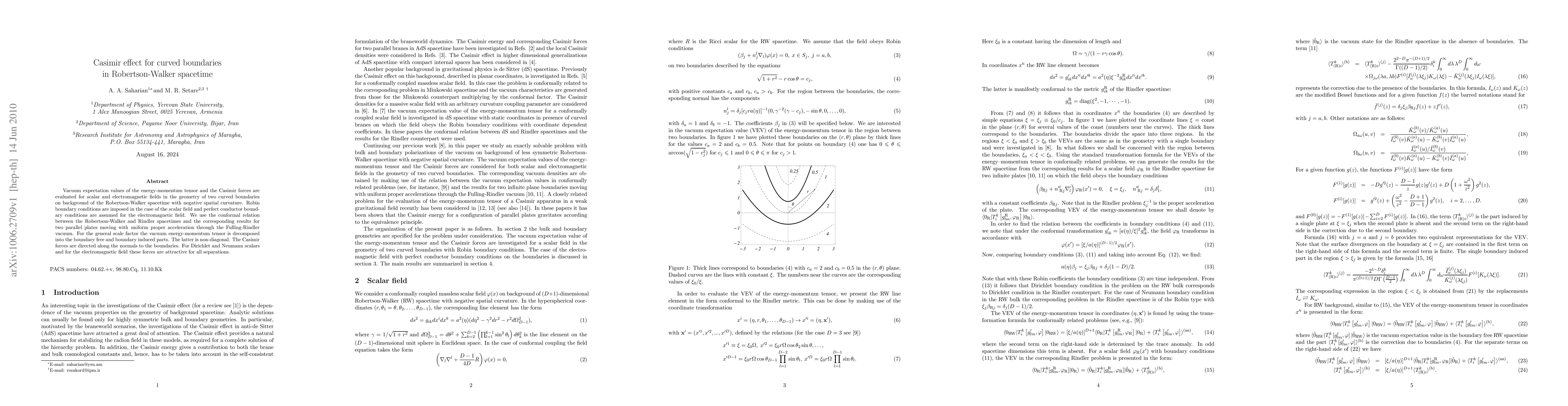This paper evaluates the vacuum expectation values of the energy-momentum tensor and Casimir forces for scalar and electromagnetic fields in a Robertson-Walker spacetime with negative spatial curvature, using curved boundaries and different boundary conditions. The Casimir forces are found to be attractive for all separations.