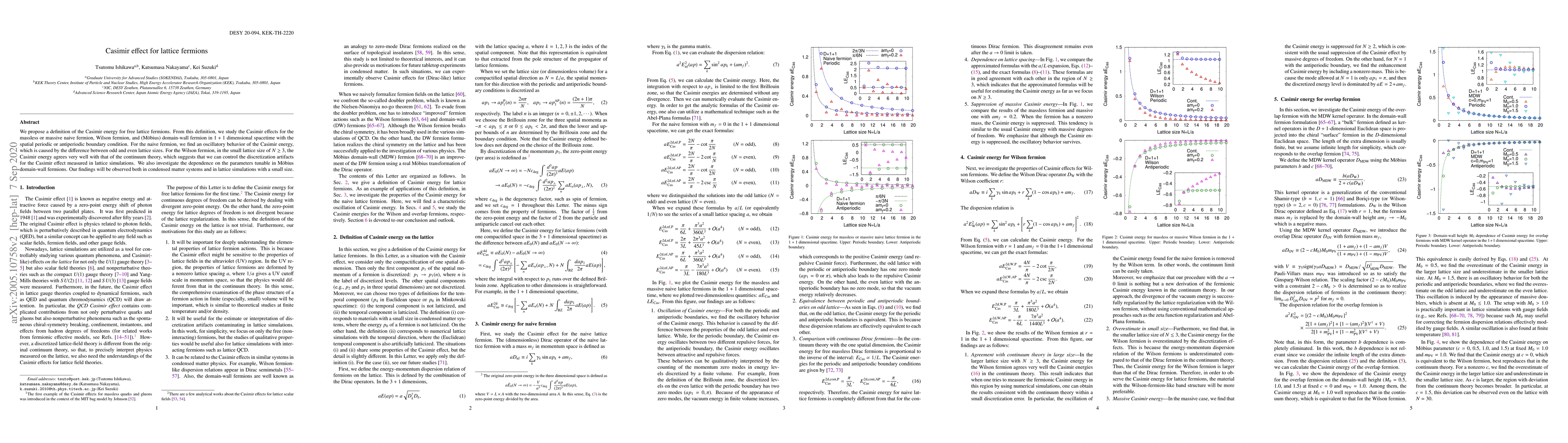 This paper defines the Casimir energy for lattice fermions and examines its behavior for different types of fermions in 1+1 dimensional spacetime. It finds oscillatory Casimir energy for naive fermions and good agreement with continuum theory for Wilson fermions in small lattice sizes, suggesting effective control over discretization artifacts.