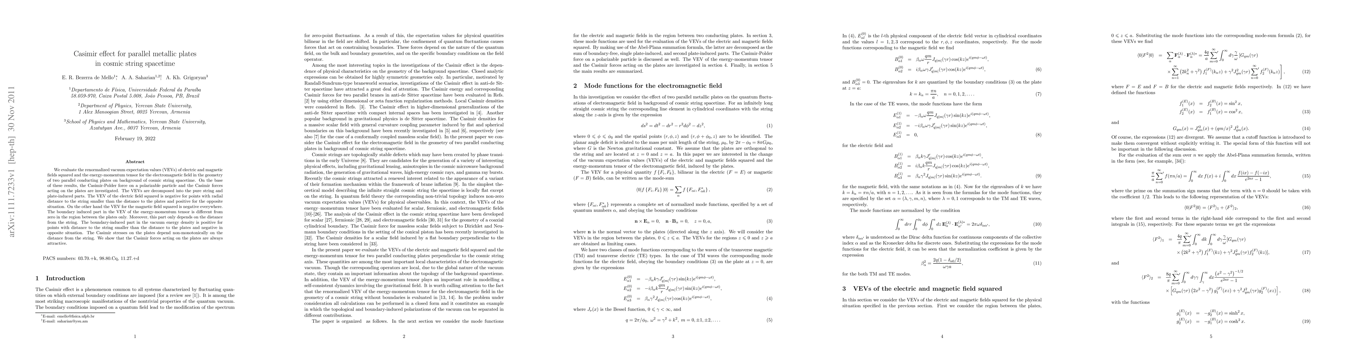 This paper investigates the Casimir effect in cosmic string spacetime between two parallel metallic plates, finding that the vacuum expectation values of electric and magnetic fields differ based on their distance to the cosmic string. The Casimir forces on the plates are always attractive and depend non-monotonically on the string's distance.