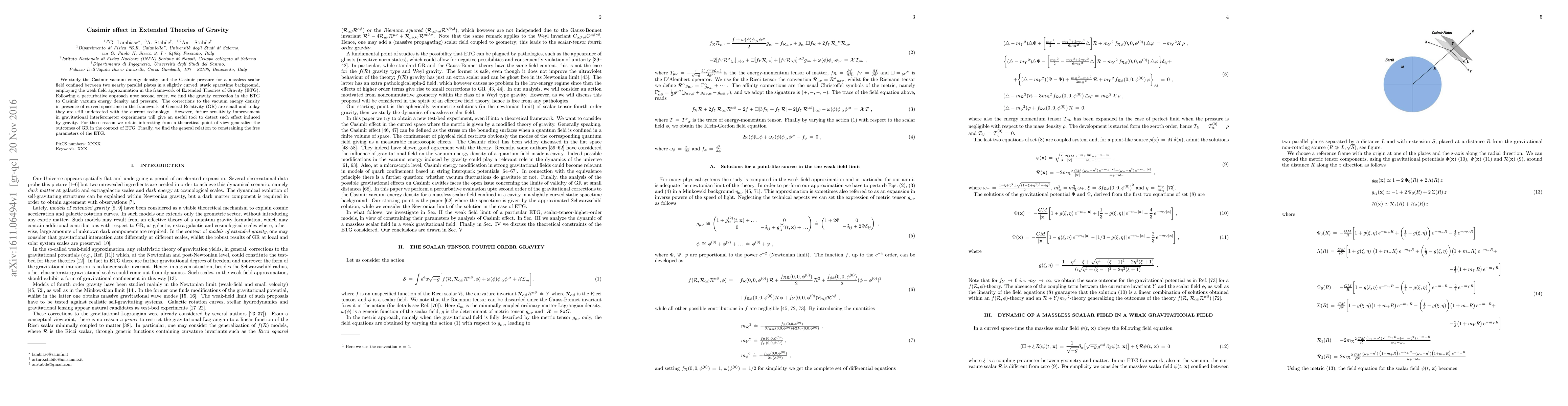 This paper investigates the Casimir effect in Extended Theories of Gravity (ETG), finding gravity corrections to the vacuum energy density and pressure for a scalar field between parallel plates in a slightly curved spacetime. While current technology cannot detect these GR-induced corrections, future advancements in gravitational interferometers may enable their detection, making the study of ETG outcomes theoretically significant and providing a means to constrain ETG parameters.