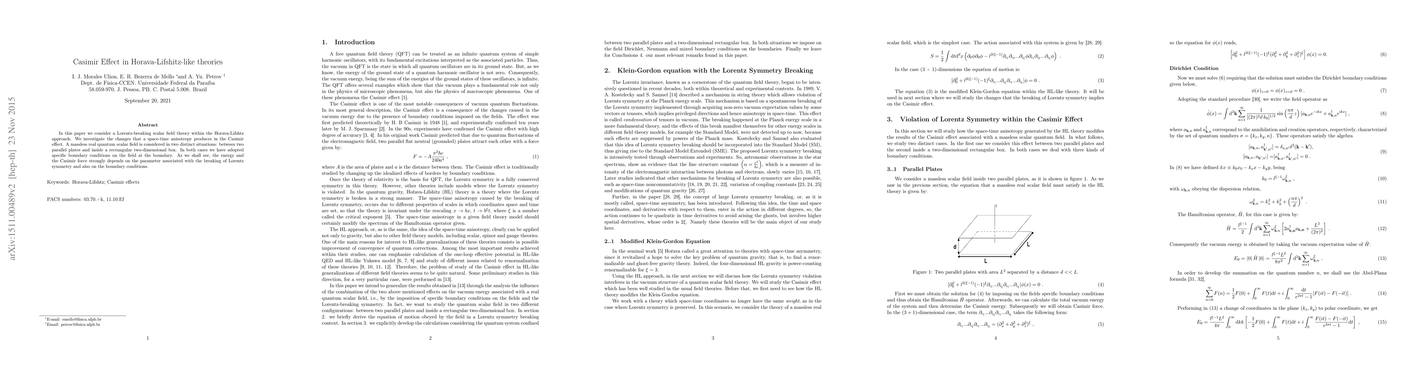 In this paper we consider a Lorentz-breaking scalar field theory within the Horava-Lifshtz approach. We investigate the changes that a space-time anisotropy produces in the Casimir effect. A massless real quantum scalar field is considered in two distinct situations: between two parallel plates and inside a rectangular two-dimensional box. In both cases we have adopted specific boundary conditions on the field at the boundary. As we shall see, the energy and the Casimir force strongly depends on the parameter associated with the breaking of Lorentz symmetry and also on the boundary conditions.
