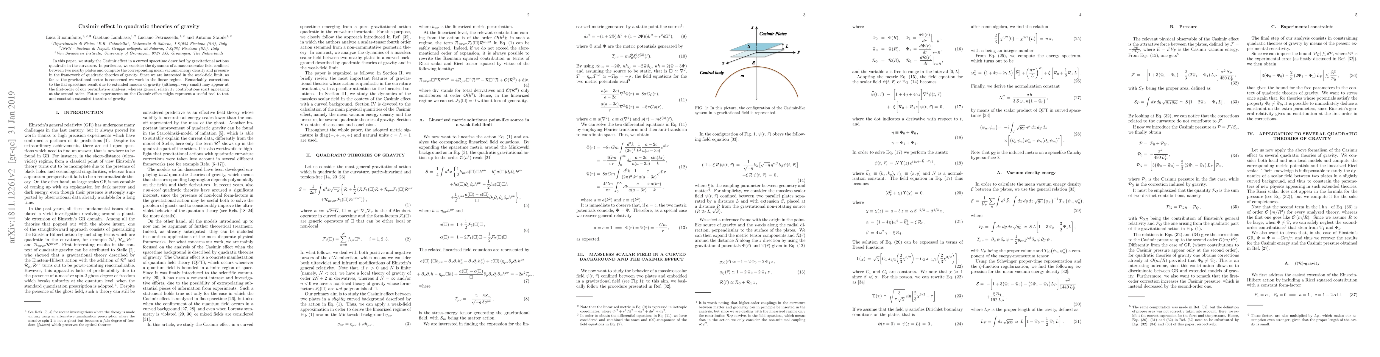 This paper investigates the Casimir effect in quadratic gravity theories, focusing on the mean vacuum energy density and pressure of a massless scalar field between two plates. It finds that extended gravity models can introduce small corrections to the flat spacetime result at the first-order perturbation, while general relativity effects appear at the second order, suggesting potential experimental tests for these theories.