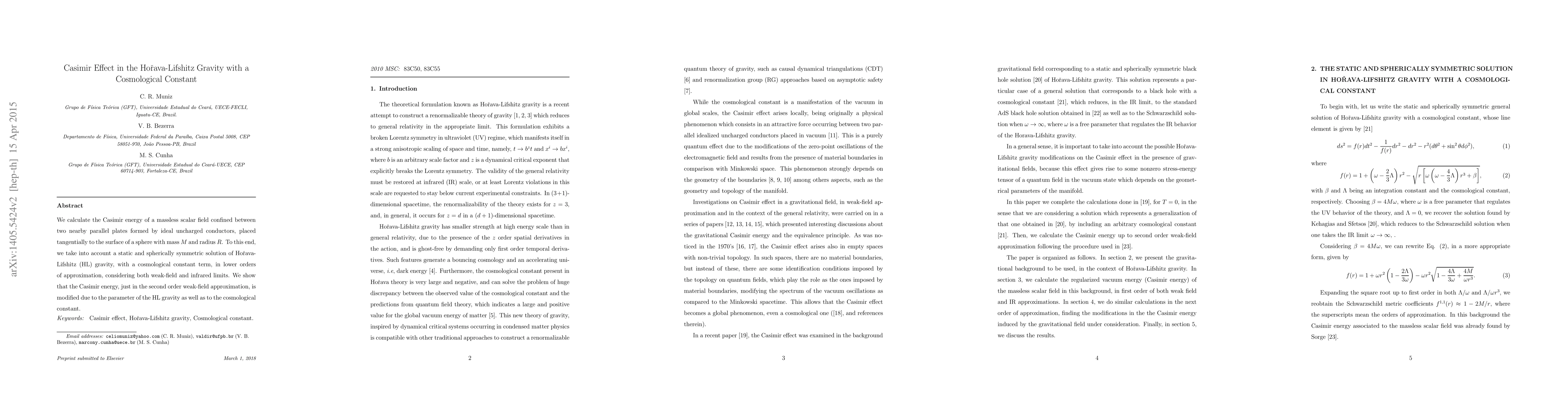 This paper calculates the Casimir energy for a massless scalar field between two parallel plates in the context of Horava-Lifshitz gravity with a cosmological constant. It shows that the Casimir energy is modified by both the HL gravity parameter and the cosmological constant, particularly in the second-order weak-field approximation.