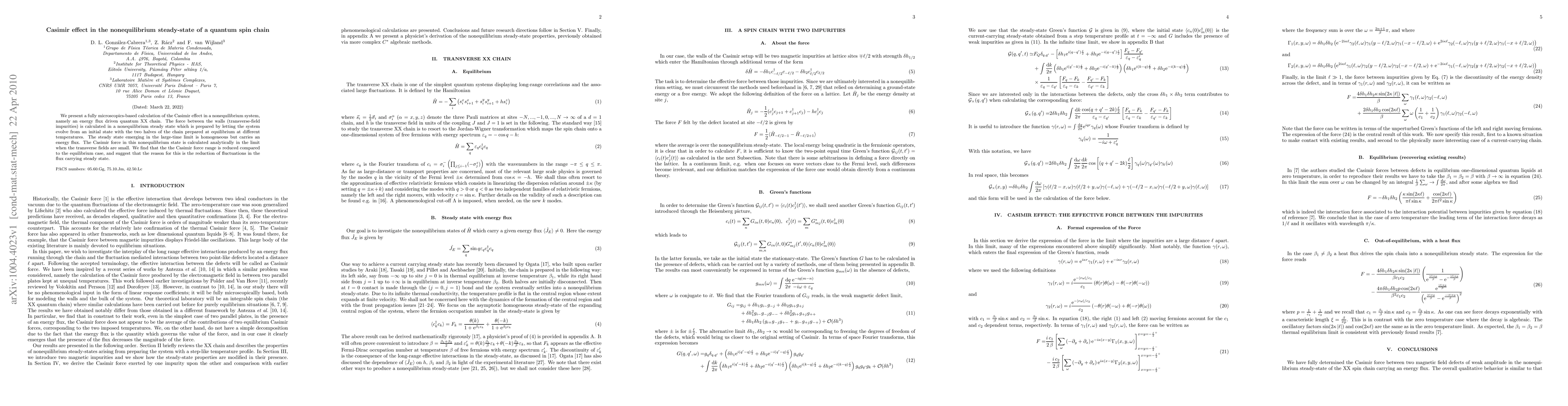 The research calculates the Casimir effect in a nonequilibrium steady-state quantum spin chain, finding a reduced force range compared to equilibrium due to diminished fluctuations in the energy flux-carrying state. The analytical calculation is performed for small transverse fields.