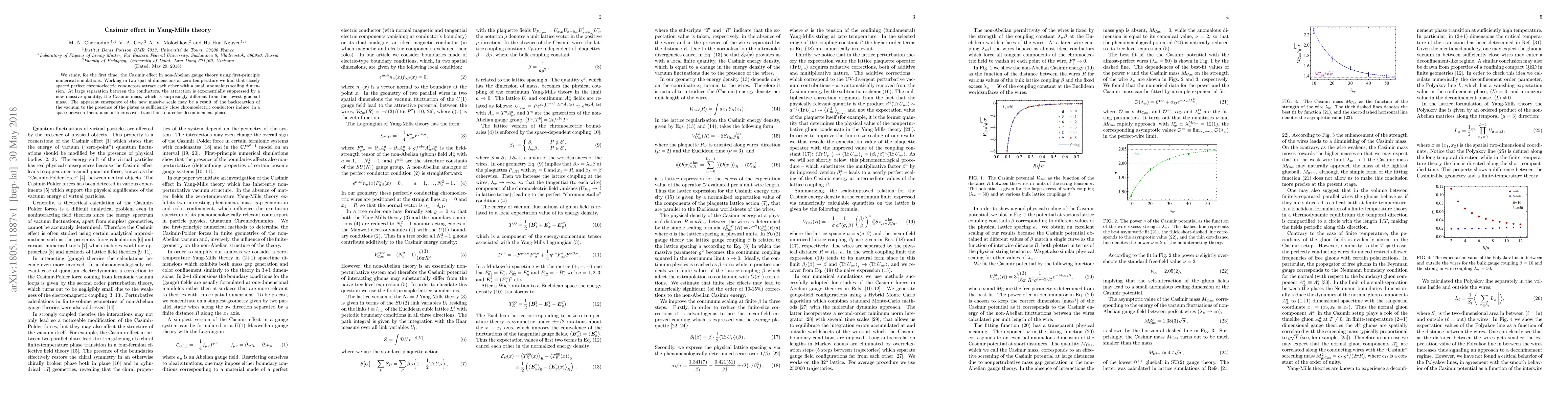 This paper investigates the Casimir effect in Yang-Mills theory through first-principle numerical simulations, revealing that closely spaced chromoelectric conductors attract each other with an anomalous scaling dimension. The attraction diminishes exponentially at larger separations due to a new Casimir mass, distinct from the lowest glueball mass, suggesting a vacuum backreaction and a transition to a color deconfinement phase.