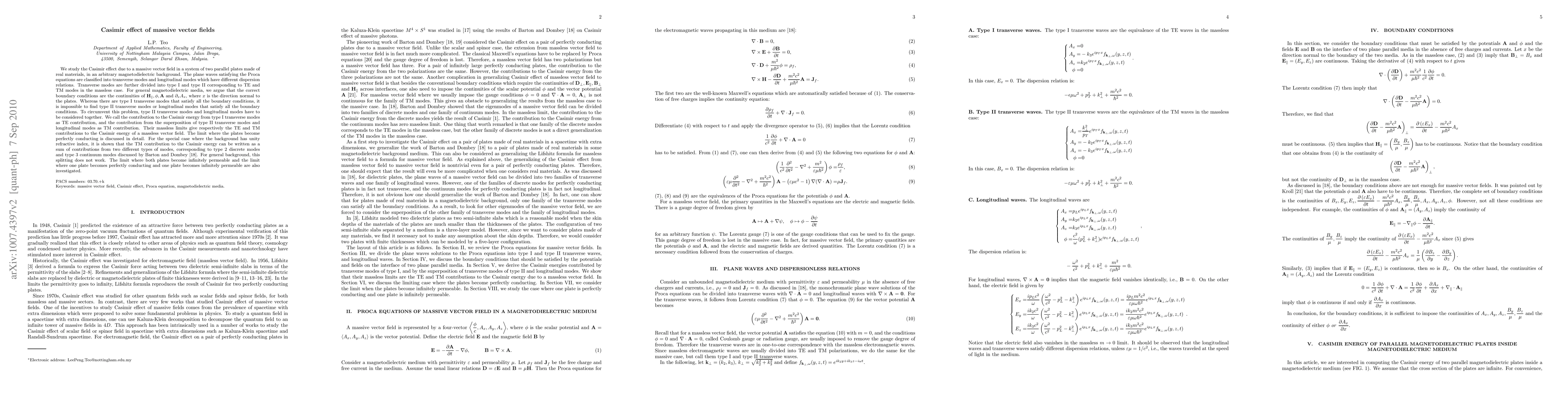 This paper investigates the Casimir effect for massive vector fields between two parallel plates in various magnetodielectric backgrounds. It classifies plane waves into transverse and longitudinal modes, and discusses the boundary conditions for these modes, revealing that only type I transverse modes fully satisfy the conditions. The study separates contributions to the Casimir energy into TE and TM components, and explores limits including perfectly conducting and infinitely permeable plates.