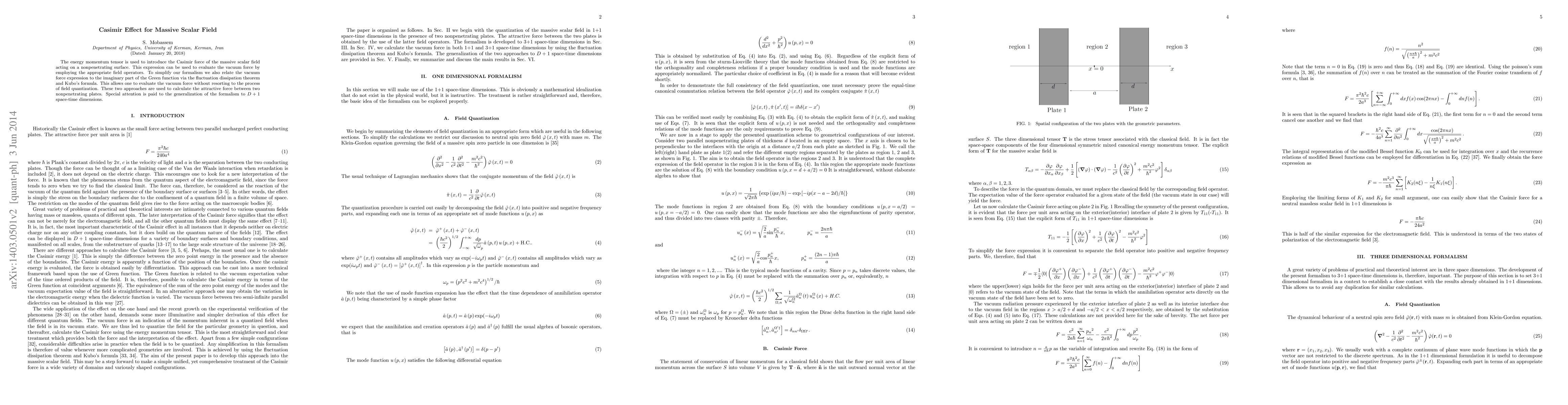 The energy momentum tensor is used to introduce the Casimir force of the massive scalar field acting on a nonpenetrating surface. This expression can be used to evaluate the vacuum force by employing the appropriate field operators. To simplify our formalism we also relates the vacuum force expression to the imaginary part of the Green function via the fluctuation dissipation theorem and Kubo formula. This allows one to evaluate the vacuum force without resorting to the process of field quantization. These two approaches are used to calculate the attractive force between two nonpenetrating plates. Special attention is paid to the generalization of the formalism to D + 1 space-time dimensions.