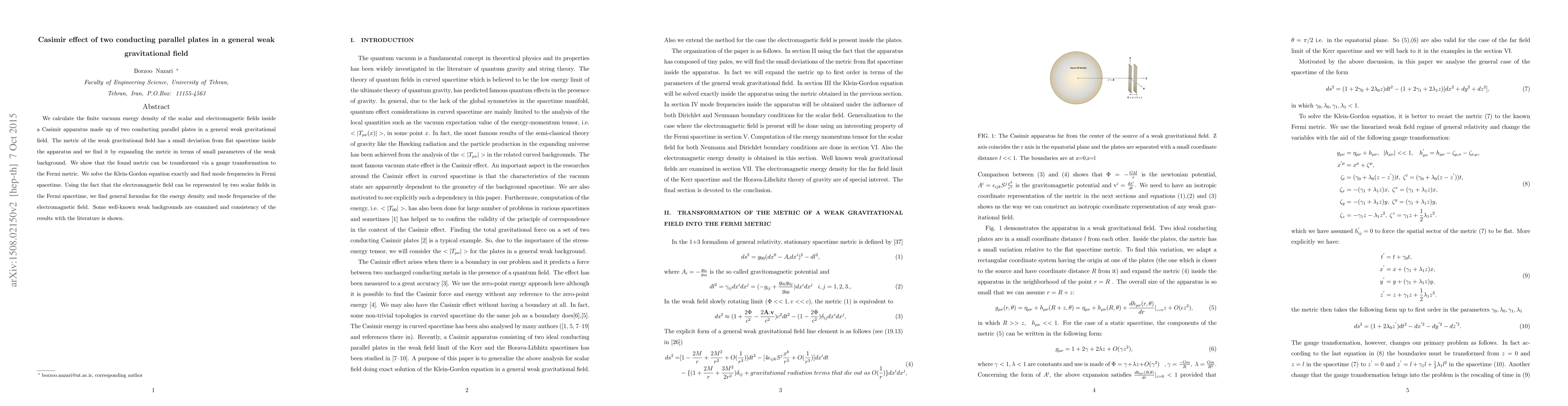 This paper calculates the vacuum energy density of scalar and electromagnetic fields in a Casimir apparatus under a general weak gravitational field, deriving exact mode frequencies and energy density formulas using the Fermi metric. It confirms consistency with existing literature for specific weak backgrounds.