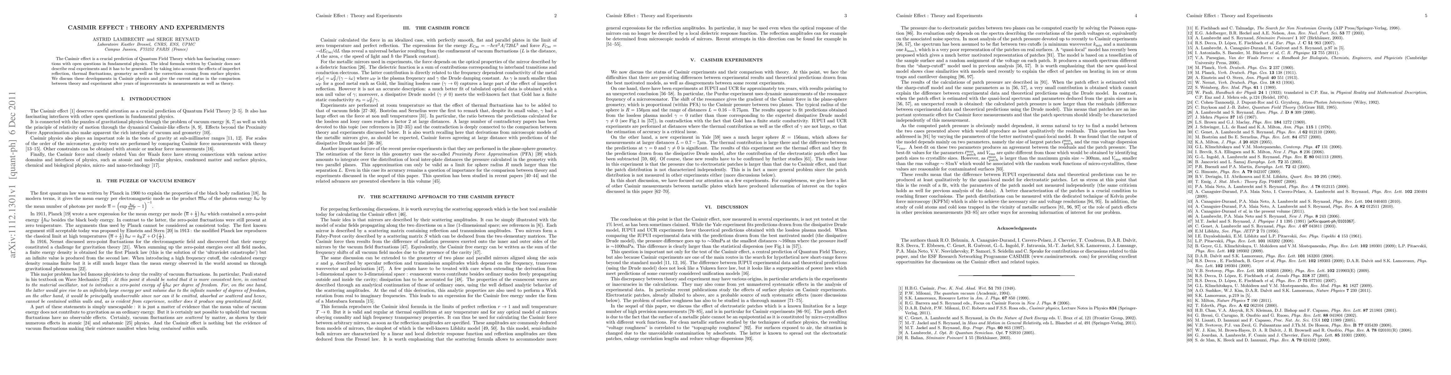 The Casimir effect, a quantum phenomenon predicted by Quantum Field Theory, has evolved with experimental and theoretical advancements addressing imperfect reflection, thermal fluctuations, geometry, and surface corrections. Current comparisons reveal ongoing progress in aligning theory with improved experimental measurements.