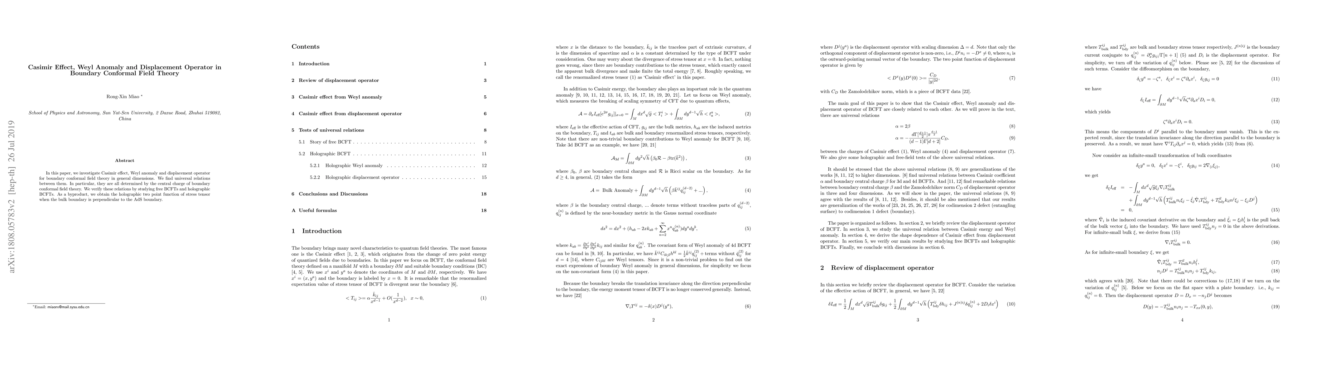 This paper explores the Casimir effect, Weyl anomaly, and displacement operator in boundary conformal field theory (BCFT), revealing universal relations determined by the central charge. It verifies these findings through free BCFTs and holographic BCFTs, and as a result, derives the holographic two-point function of the stress tensor in specific configurations.