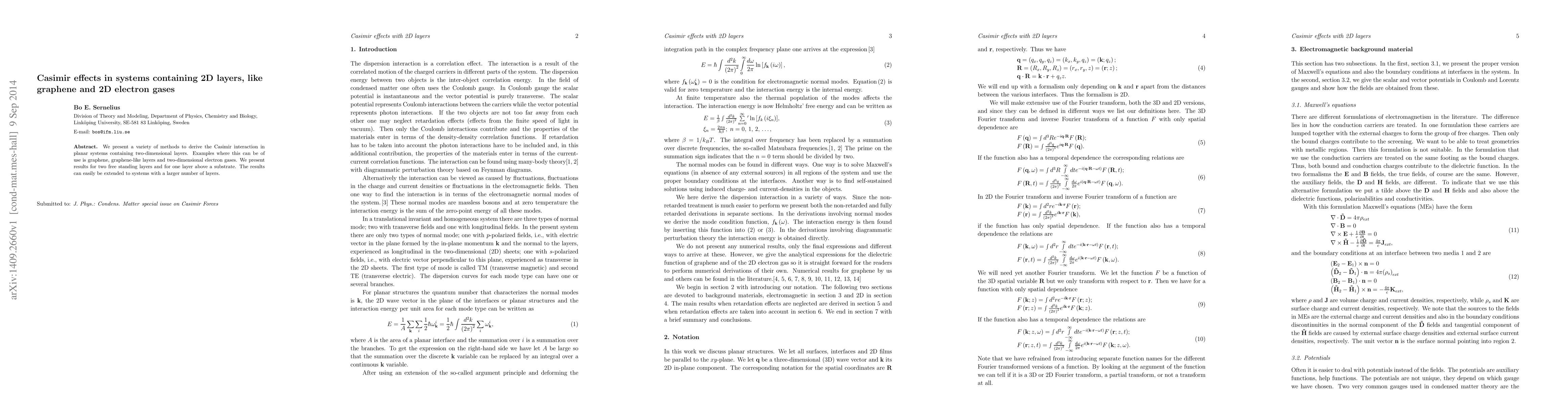 We present a variety of methods to derive the Casimir interaction in planar systems containing two-dimensional layers. Examples where this can be of use is graphene, graphene-like layers and two-dimensional electron gases. We present results for two free standing layers and for one layer above a substrate. The results can easily be extended to systems with a larger number of layers.