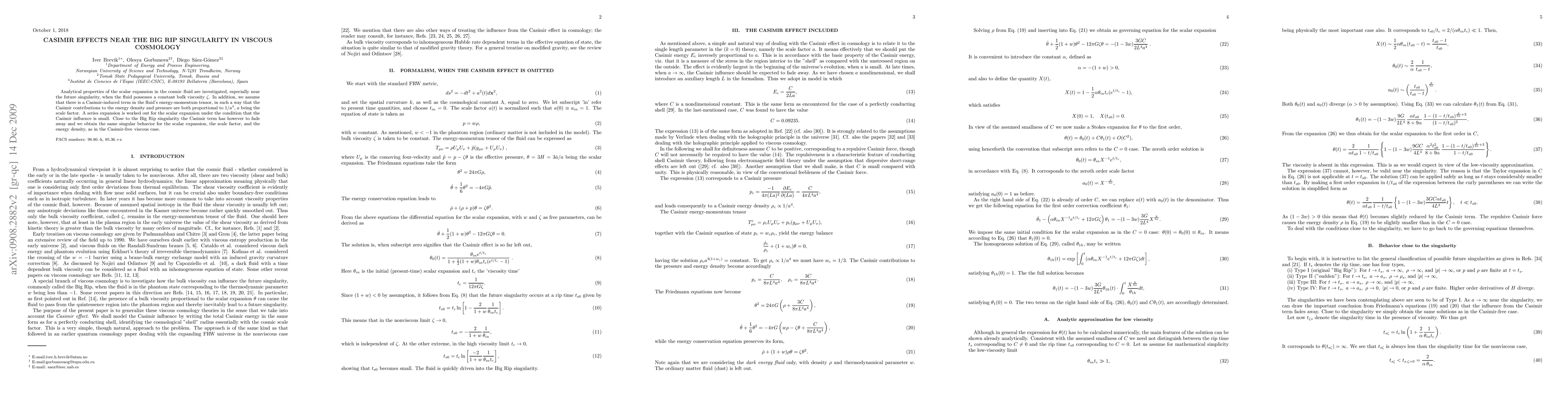 Analytical properties of the scalar expansion in the cosmic fluid are investigated, especially near the future singularity, when the fluid possesses a constant bulk viscosity \zeta. In addition, we assume that there is a Casimir-induced term in the fluid's energy-momentum tensor, in such a way that the Casimir contributions to the energy density and pressure are both proportional to 1/a^4, 'a' being the scale factor. A series expansion is worked out for the scalar expansion under the condition that the Casimir influence is small. Close to the Big Rip singularity the Casimir term has however to fade away and we obtain the same singular behavior for the scalar expansion, the scale factor, and the energy density, as in the Casimir-free viscous case.