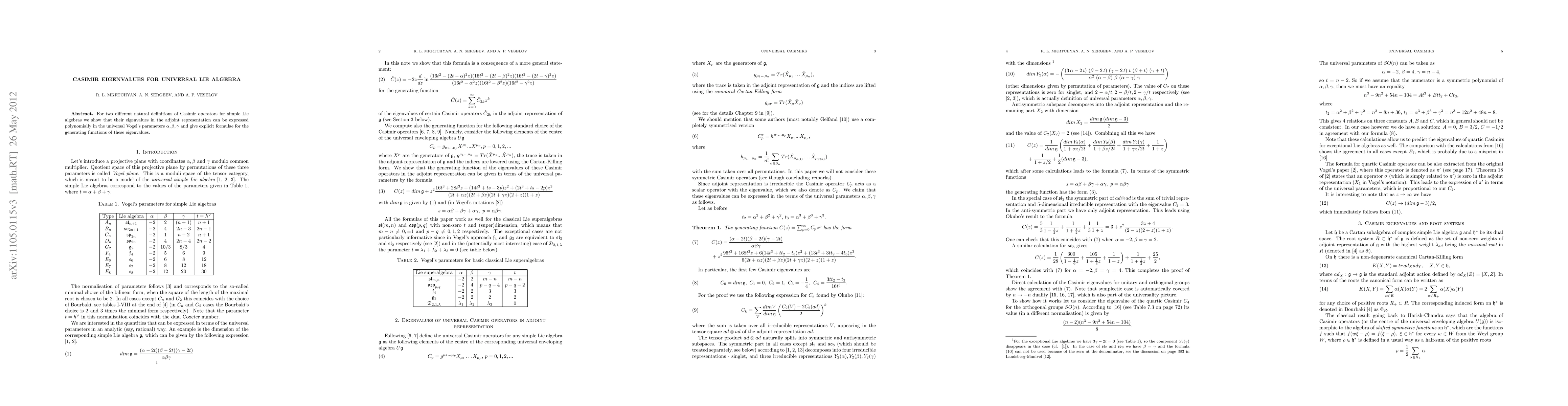 For two different natural definitions of Casimir operators for simple Lie algebras we show that their eigenvalues in the adjoint representation can be expressed polynomially in the universal Vogel's parameters $\alpha, \beta, \gamma$ and give explicit formulae for the generating functions of these eigenvalues.