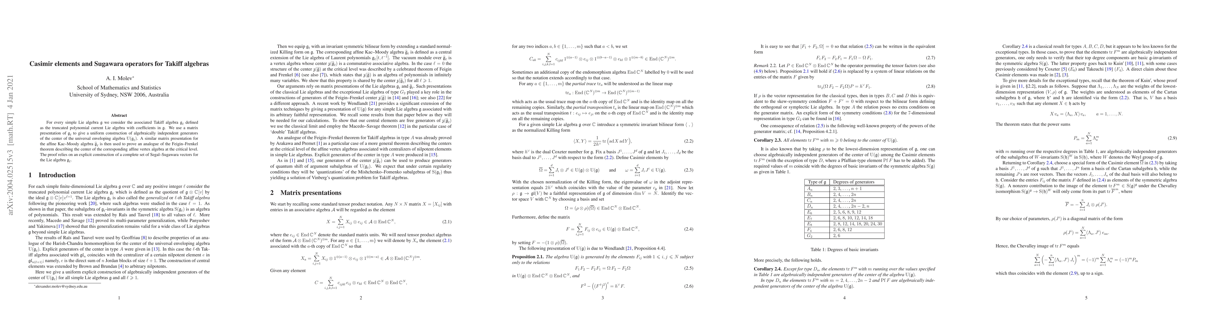 This paper constructs algebraically independent generators for the center of the universal enveloping algebra of Takiff algebras using matrix presentations. It also proves an analogue of the Feigin--Frenkel theorem for affine vertex algebras by constructing a complete set of Segal--Sugawara vectors for the associated Lie algebra.