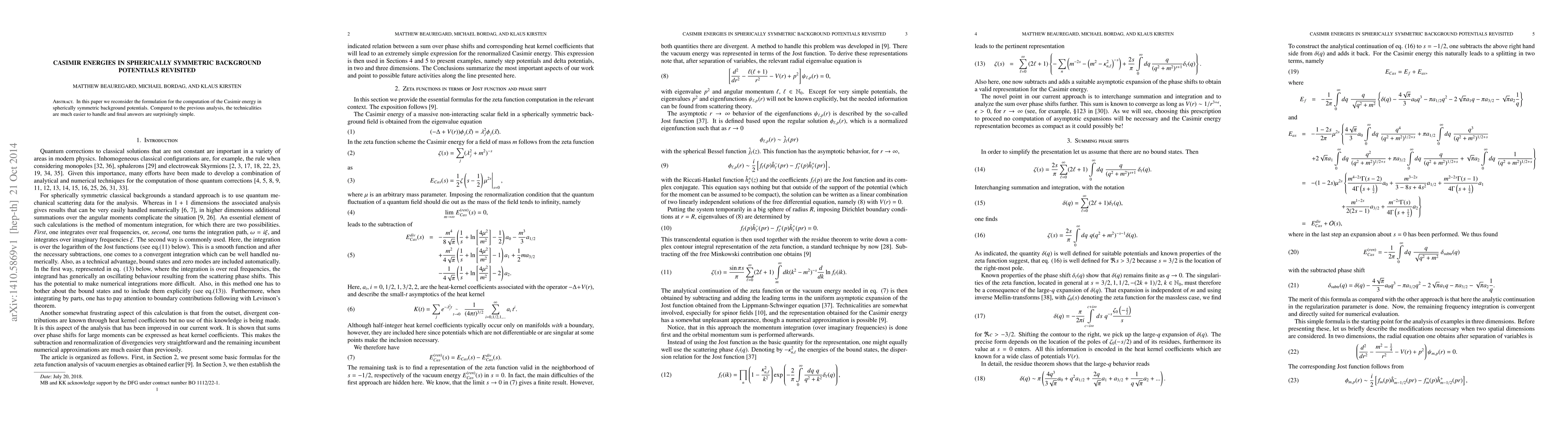In this paper we reconsider the formulation for the computation of the Casimir energy in spherically symmetric background potentials. Compared to the previous analysis, the technicalities are much easier to handle and final answers are surprisingly simple.