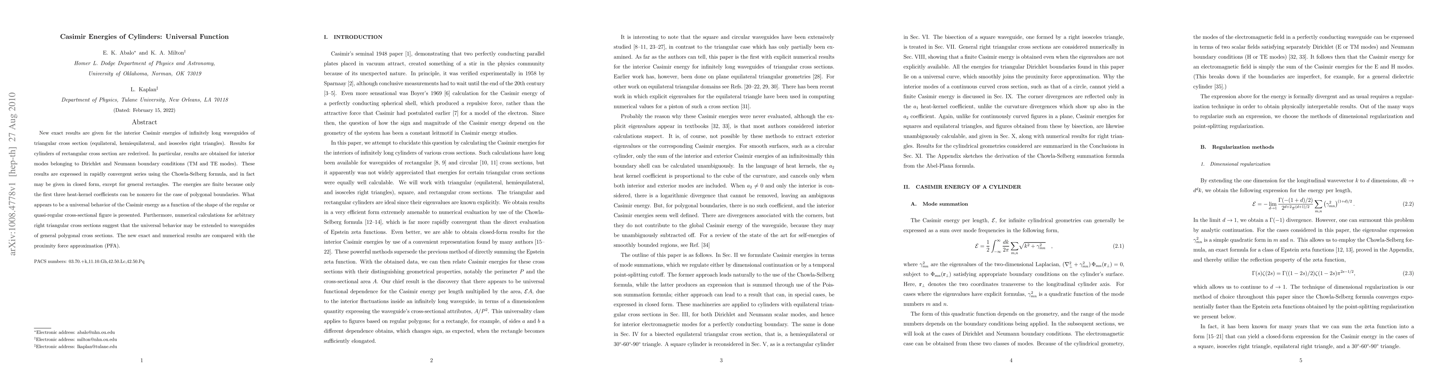 New exact results are given for the interior Casimir energies of infinitely long waveguides of triangular cross section (equilateral, hemiequilateral, and isosceles right triangles). Results for cylinders of rectangular cross section are rederived. In particular, results are obtained for interior modes belonging to Dirichlet and Neumann boundary conditions (TM and TE modes). These results are expressed in rapidly convergent series using the Chowla-Selberg formula, and in fact may be given in closed form, except for general rectangles. The energies are finite because only the first three heat-kernel coefficients can be nonzero for the case of polygonal boundaries. What appears to be a universal behavior of the Casimir energy as a function of the shape of the regular or quasi-regular cross-sectional figure is presented. Furthermore, numerical calculations for arbitrary right triangular cross sections suggest that the universal behavior may be extended to waveguides of general polygonal cross sections. The new exact and numerical results are compared with the proximity force approximation (PFA).