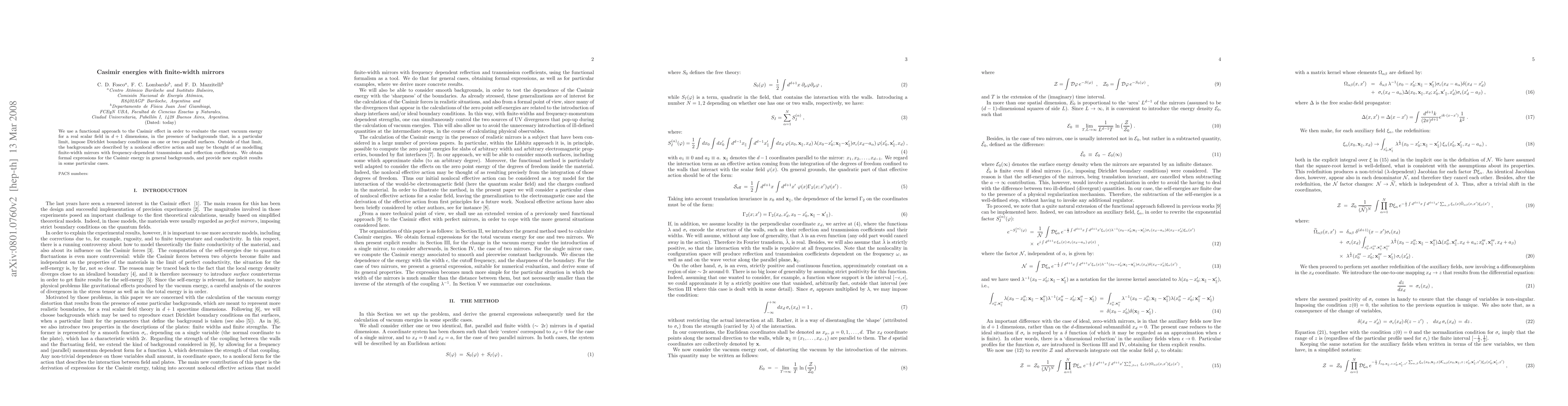 We use a functional approach to the Casimir effect in order to evaluate the exact vacuum energy for a real scalar field in $d+1$ dimensions, in the presence of backgrounds that, in a particular limit, impose Dirichlet boundary conditions on one or two parallel surfaces. Outside of that limit, the background may be thought of as describing finite-width mirrors with frequency-dependent transmission and reflection coefficients. We provide new explicit results for the Casimir energy in some particular backgrounds