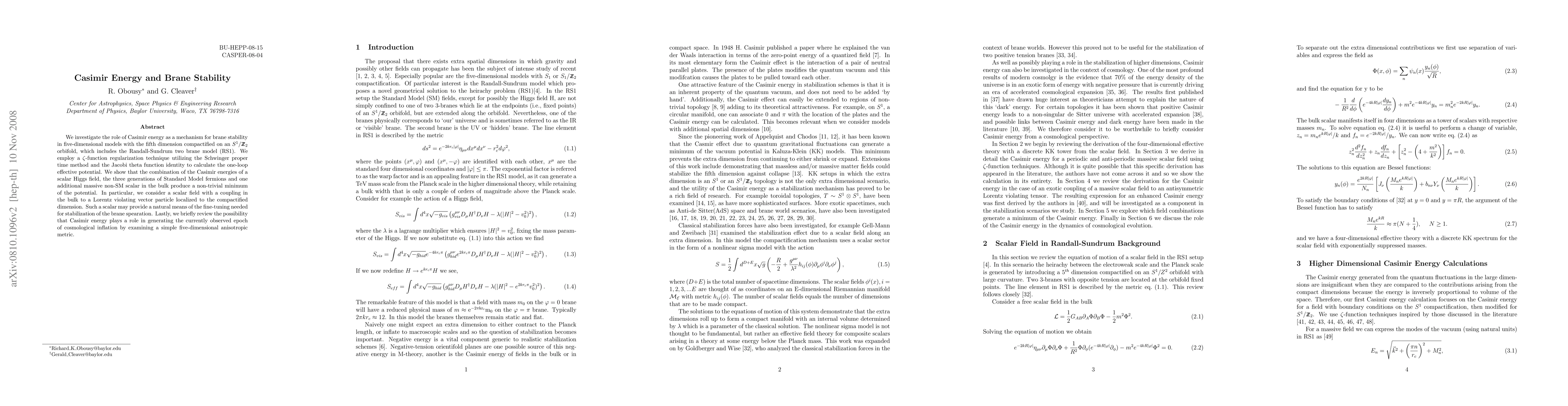 We investigate the role of Casimir energy as a mechanism for brane stability in five-dimensional models with the fifth dimension compactified on an S^1\Z_2 orbifold, which includes the Randall-Sundrum two brane model (RS1). We employ a zeta-function regularization technique utilizing the Schwinger proper time method and the Jacobi theta function identity to calculate the one-loop effective potential. We show that the combination of the Casimir energies of a scalar Higgs field, the three generations of Standard Model fermions and one additional massive non-SM scalar in the bulk produce a non-trivial minimum of the potential. In particular, we consider a scalar field with a coupling in the bulk to a Lorentz violating vector particle localized to the compactified dimension. Such a scalar may provide a natural means of the fine-tuning needed for stabilization of the brane spearation. Lastly, we briefly review the possibility that Casimir energy plays a role in generating the currently observed epoch of cosmological inflation by examining a simple five-dimensional anisotropic metric.