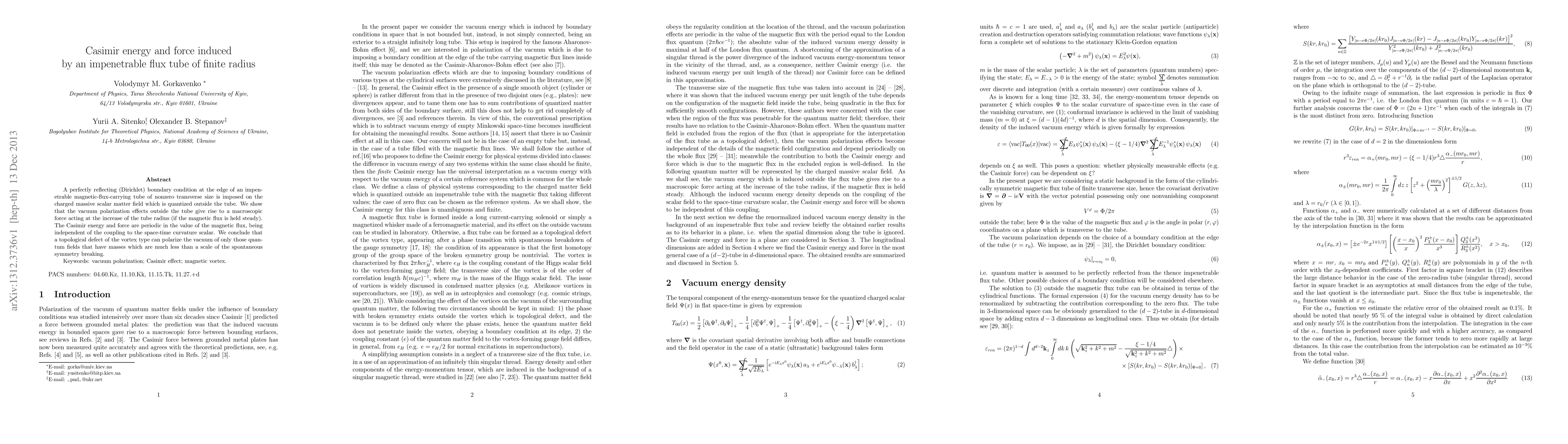 Summary: The study quantizes a charged scalar field around a magnetic flux tube with reflecting boundaries, revealing a macroscopic force due to vacuum polarization that increases with the tube's radius. The Casimir energy and force are periodic in magnetic flux and independent of spacetime curvature, indicating that vortex-type topological defects can polarize vacuum fields with low masses.