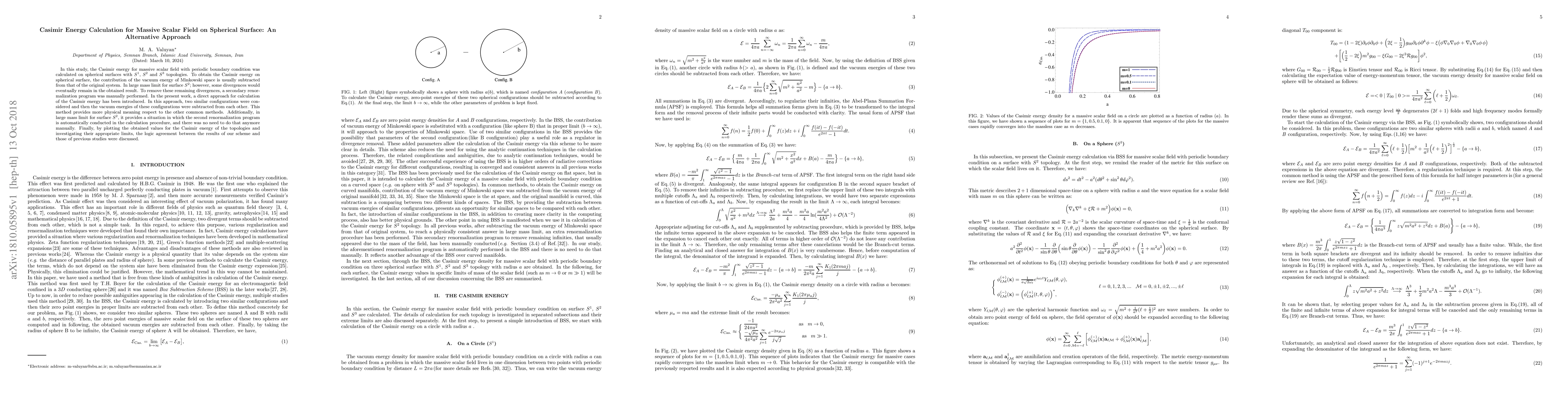 In this study, the Casimir energy for massive scalar field with periodic boundary condition was calculated on spherical surfaces with $S^1$, $S^2$ and $S^3$ topologies. To obtain the Casimir energy on spherical surface, the contribution of the vacuum energy of Minkowski space is usually subtracted from that of the original system. In large mass limit for surface $S^2$; however, some divergences would eventually remain in the obtained result. To remove these remaining divergences, a secondary renormalization program was manually performed. In the present work, a direct approach for calculation of the Casimir energy has been introduced. In this approach, two similar configurations were considered and then the vacuum energies of these configurations were subtracted from each other. This method provides more physical meaning respect to the other common methods. Additionally, in large mass limit for surface $S^2$, it provides a situation in which the second renormalization program is automatically conducted in the calculation procedure, and there was no need to do that anymore manually. Finally, by plotting the obtained values for the Casimir energy of the topologies and investigating their appropriate limits, the logic agreement between the results of our scheme and those of previous studies were discussed.