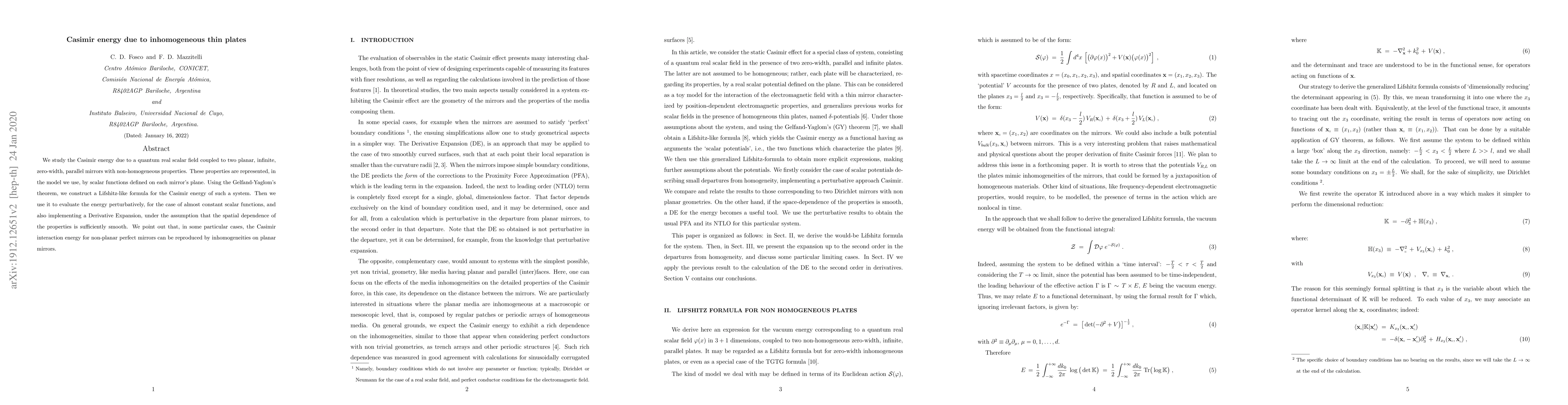 This paper investigates the Casimir energy from a quantum scalar field interacting with two parallel, infinite, non-homogeneous thin plates. It employs the Gelfand-Yaglom theorem to derive a Lifshitz-like formula and evaluates the energy perturbatively, revealing that inhomogeneities on planar mirrors can mimic the Casimir interaction energy of non-planar perfect mirrors.