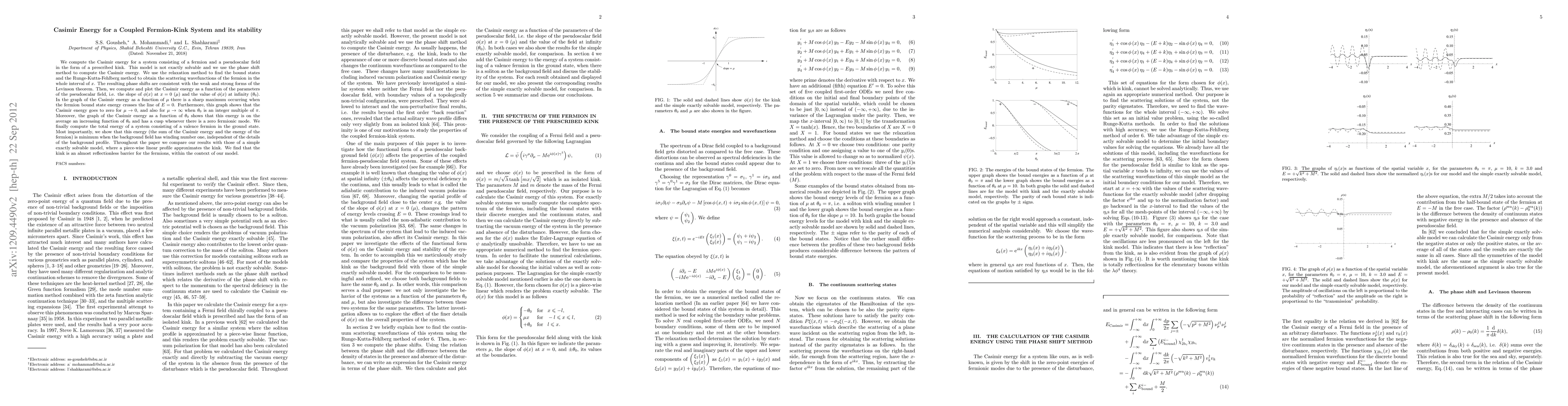We compute the Casimir energy for a system consisting of a fermion and a pseudoscalar field in the form of a prescribed kink. This model is not exactly solvable and we use the phase shift method to compute the Casimir energy. We use the relaxation method to find the bound states and the Runge-Kutta-Fehlberg method to obtain the scattering wavefunctions of the fermion in the whole interval of $x$. The resulting phase shifts are consistent with the weak and strong forms of the Levinson theorem. Then, we compute and plot the Casimir energy as a function of the parameters of the pseudoscalar field, i.e. the slope of $\phi(x)$ at x=0 ($\mu$) and the value of $\phi(x)$ at infinity ($\theta_0$). In the graph of the Casimir energy as a function of $\mu$ there is a sharp maximum occurring when the fermion bound state energy crosses the line of E=0. Furthermore, this graph shows that the Casimir energy goes to zero for $\mu\rightarrow 0$, and also for $\mu\rightarrow \infty$ when $\theta_0$ is an integer multiple of $\pi$. Moreover, the graph of the Casimir energy as a function of $\theta_0$ shows that this energy is on the average an increasing function of $\theta_0$ and has a cusp whenever there is a zero fermionic mode. We finally compute the total energy of a system consisting of a valence fermion in the ground state. Most importantly, we show that this energy (the sum of the Casimir energy and the energy of the fermion) is minimum when the background field has winding number one, independent of the details of the background profile. Throughout the paper we compare our results with those of a simple exactly solvable model, where a piece-wise linear profile approximates the kink. We find that the kink is an almost reflectionless barrier for the fermions, within the context of our model.