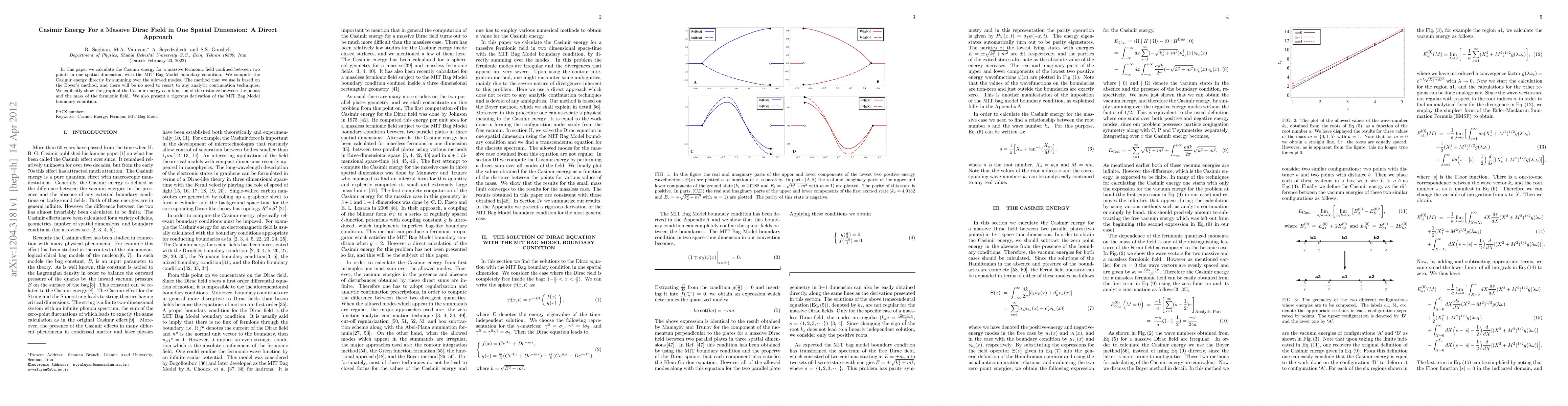 This paper calculates the Casimir energy for a massive Dirac field in one spatial dimension using the MIT Bag Model boundary condition, employing a direct summation method without analytic continuation. It presents a graph of the Casimir energy versus the distance and mass, and provides a rigorous derivation of the boundary condition.