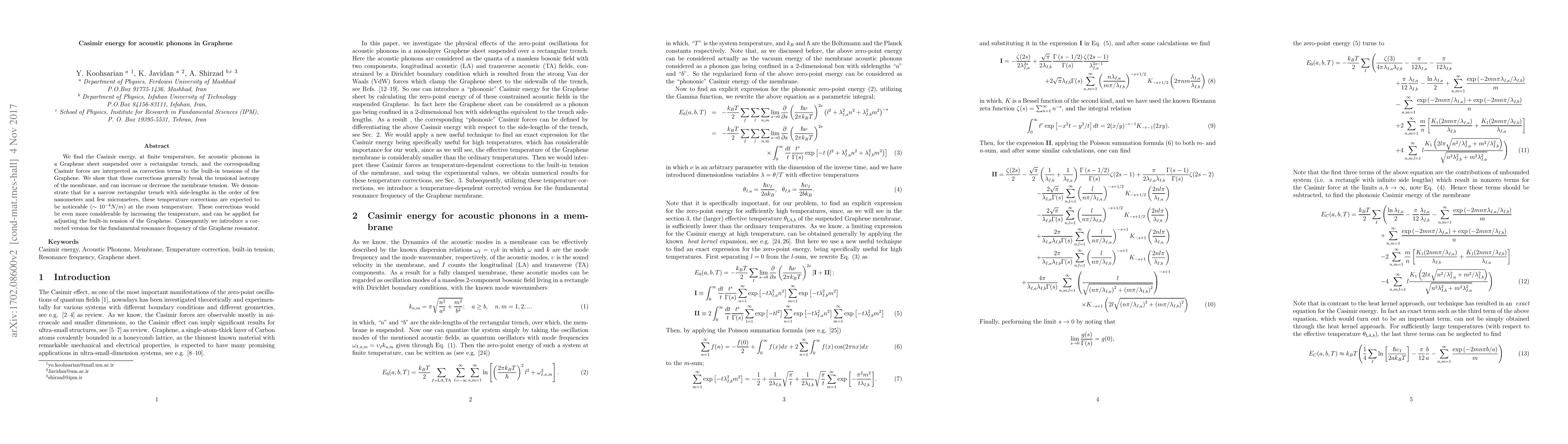 We find the Casimir energy, at finite temperature, for acoustic phonons in a Graphene sheet suspended over a rectangular trench, and the corresponding Casimir forces are interpreted as correction terms to the built-in tensions of the Graphene. We show that these corrections generally break the tensional isotropy of the membrane, and can increase or decrease the membrane tension. We demonstrate that for a narrow rectangular trench with side-lengths in the order of few nanometers and few micrometers, these temperature corrections are expected to be noticeable ($\sim 10^{-4} N/m$) at the room temperature. These corrections would be even more considerable by increasing the temperature, and can be applied for adjusting the built-in tension of the Graphene. Consequently we introduce a corrected version for the fundamental resonance frequency of the Graphene resonator.