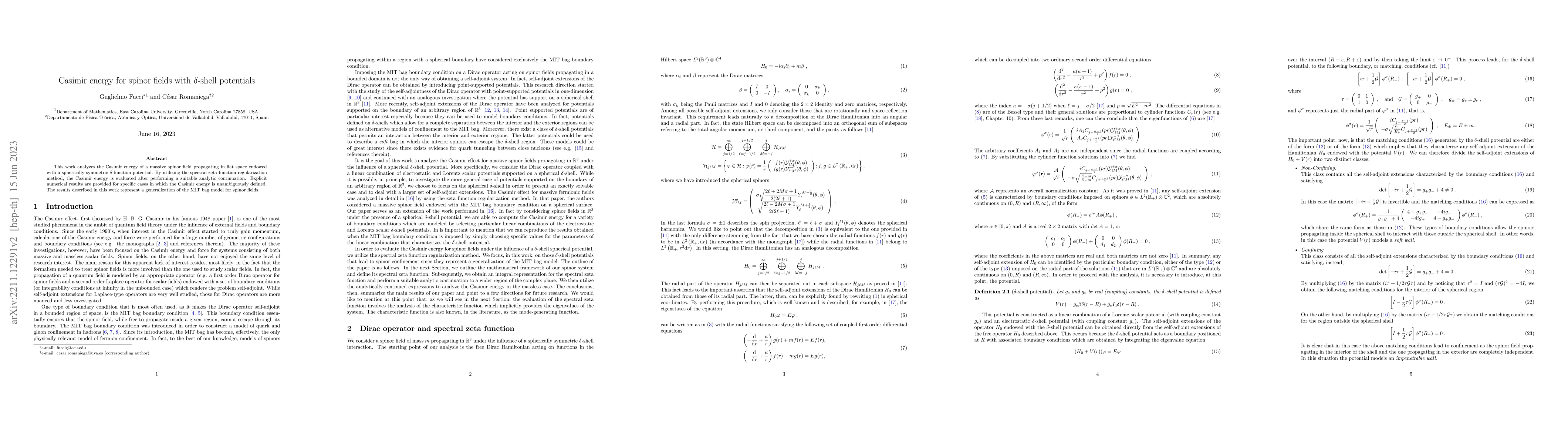This paper evaluates the Casimir energy for massive spinor fields influenced by a spherically symmetric $\delta$-shell potential using spectral zeta function regularization, providing explicit numerical results and generalizing the MIT bag model for spinor fields.