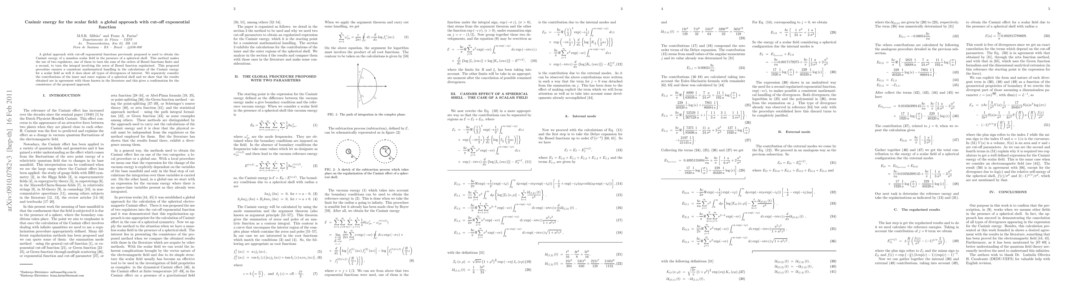 This paper proposes a global approach to calculate Casimir energy for a massless scalar field near a spherical shell using cut-off exponential functions, confirming known results and showing consistent mathematical handling of divergences.