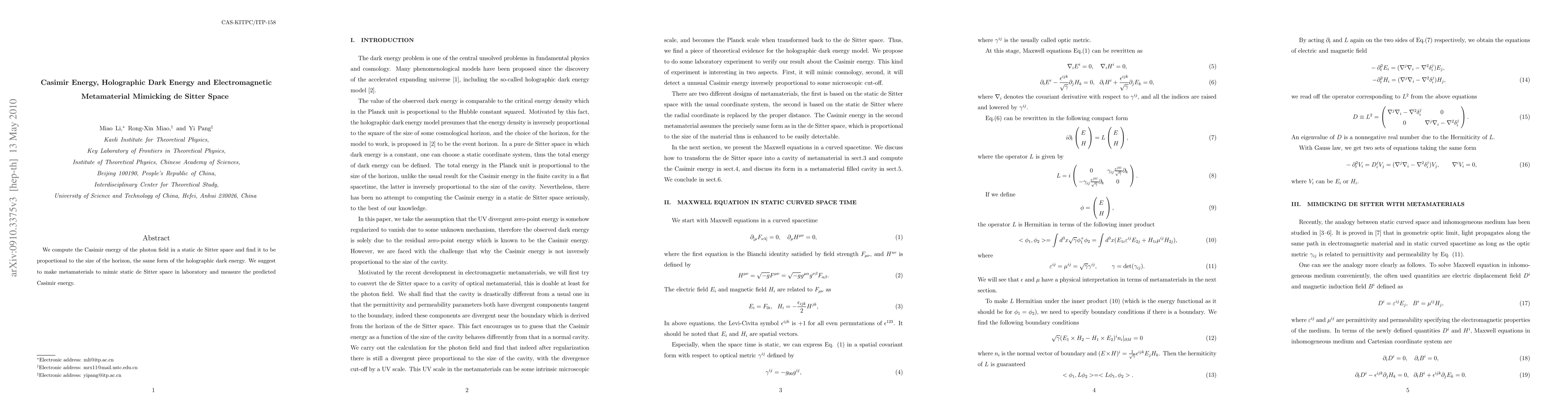 This paper computes the Casimir energy of photons in de Sitter space, finding it proportional to the horizon size, akin to holographic dark energy. It proposes using electromagnetic metamaterials to simulate de Sitter conditions and measure the predicted Casimir energy.