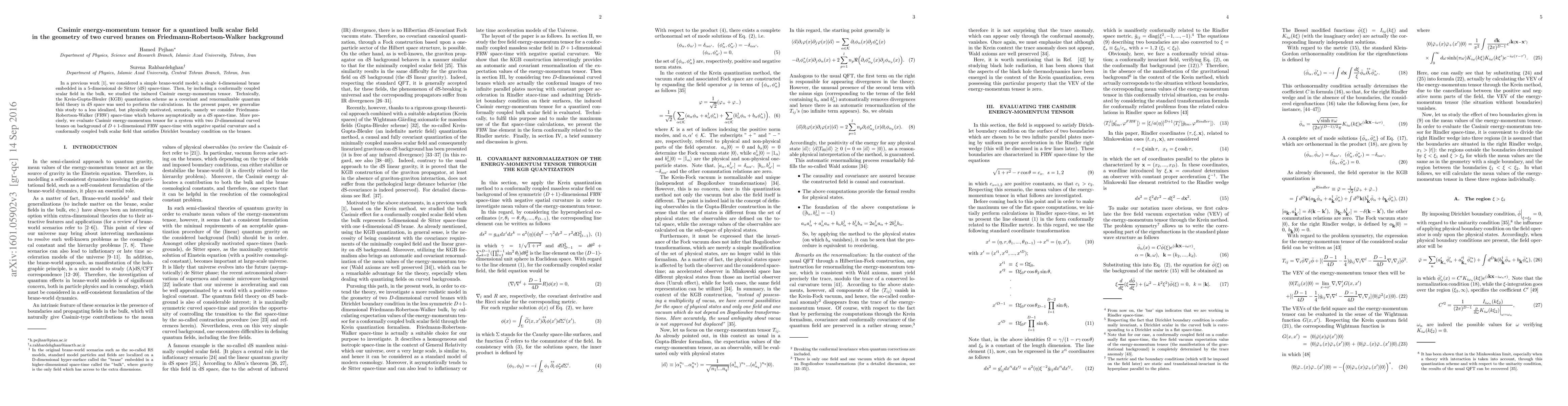 In a previous work [S. Rahbardehghan et al. in Phys. Lett. B 750, 627 (2015)], we considered a simple brane-world model; a single $4$-dimensional brane embedded in a $5$-dimensional de Sitter (dS) space-time. Then, by including a conformally coupled scalar field in the bulk, we studied the induced Casimir energy-momentum tensor. Technically, the Krein-Gupta-Bleuler (KGB) quantization scheme as a covariant and renormalizable quantum field theory in dS space was used to perform the calculations. In the present paper, we generalize this study to a less idealized, but physically motivated, scenario, namely we consider Friedmann-Robertson-Walker (FRW) space-time which behaves asymptotically as a dS space-time. More precisely, we evaluate Casimir energy-momentum tensor for a system with two $D$-dimensional curved branes on background of $D+1$-dimensional FRW space-time with negative spatial curvature and a conformally coupled bulk scalar field that satisfies Dirichlet boundary condition on the branes.