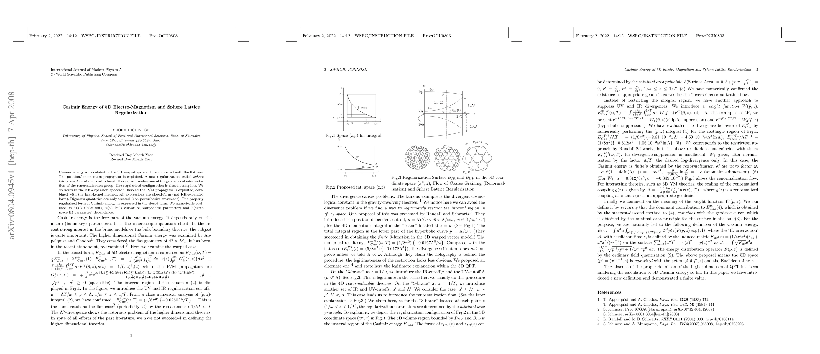 This paper calculates the Casimir energy in a 5D warped electro-magnetism system using a new regularization method called sphere lattice regularization. It employs the position/momentum propagator and the heat-kernel method for a closed-form expression, avoiding the KK-expansion approach.