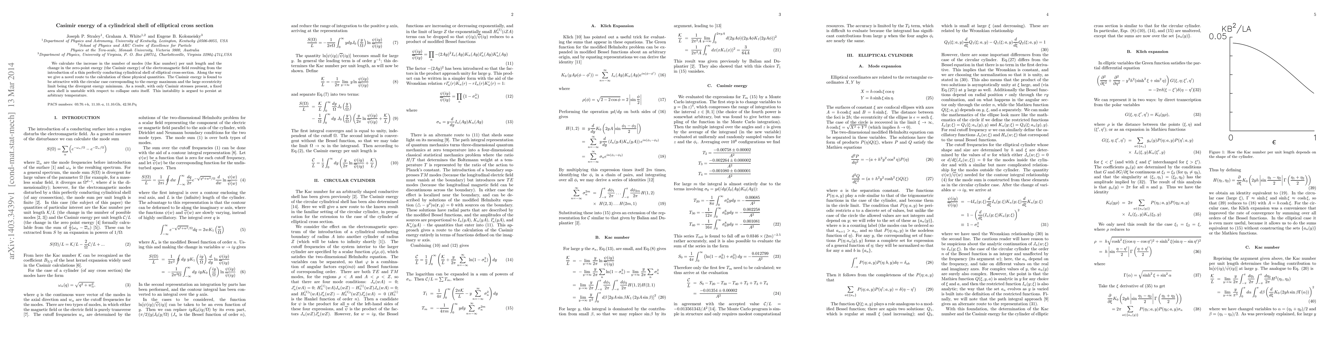 We calculate the increase in the number of modes (the Kac number) per unit length and the change in the zero-point energy (the Casimir energy) of the electromagnetic field resulting from the introduction of a thin perfectly conducting cylindrical shell of elliptical cross-section. Along the way we give a novel route to the calculation of these physical quantities. The Casimir energy is found to be attractive with the circular case corresponding to the energy maximum and the large eccentricity limit being the divergent energy minimum. As a result, with only Casimir stresses present, a fixed area shell is unstable with respect to collapse onto itself. This instability is argued to persist at arbitrary temperature.
