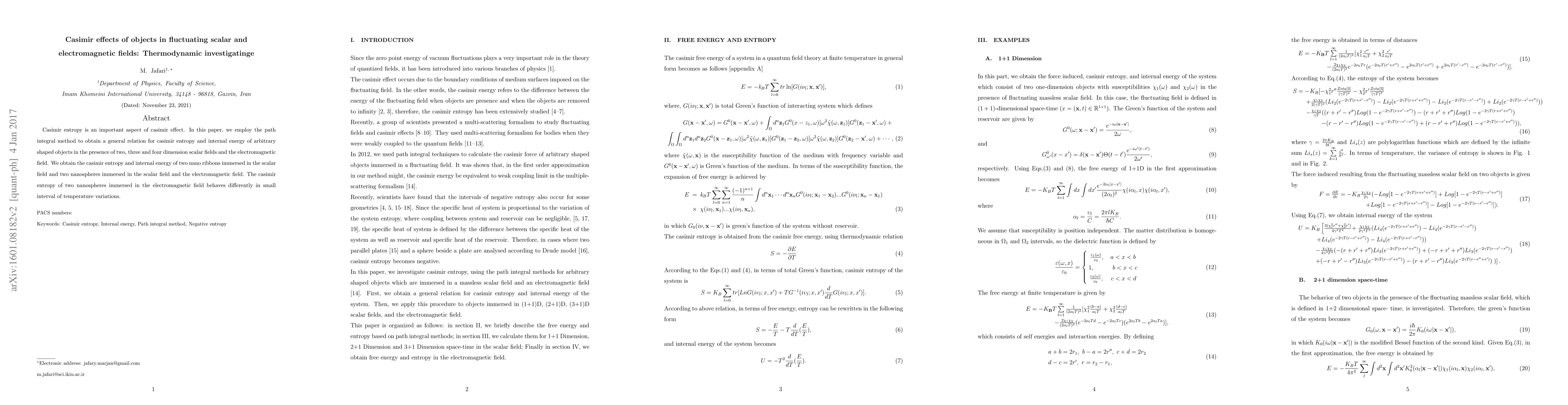 This paper uses the path integral method to derive the Casimir entropy and internal energy for objects in fluctuating scalar and electromagnetic fields. It specifically examines two nanoribbons and two nanospheres, revealing distinct Casimir entropy behaviors in electromagnetic fields under small temperature variations.